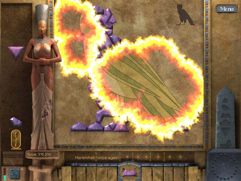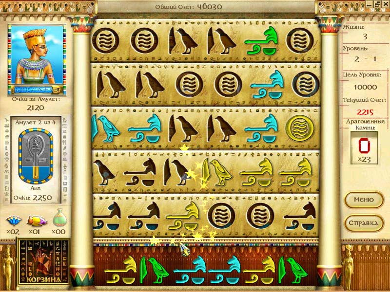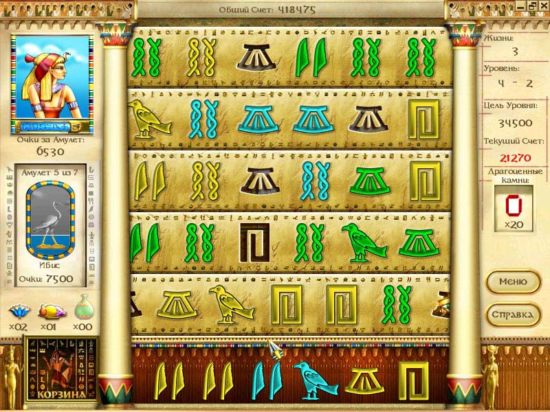 Мудрый бог Тот уже обучил египтян алфавиту, верный раб вычертил необходимые знаки на папирусе, бронзовых жерновах и стенах, а нам остается только заполнить яркой тушью подготовленный трафарет. За небольшой промежуток времени нужно написать иероглифами несколько молитв и лозунгов, описаний событий из жизни богов и правителей. Главное, успеть это сделать вовремя, дабы не прогневать своей глупостью и небрежностью Тота. Щелчком мыши перетягиваем из нижнего ряда в пустующий трафарет необходимые иероглифы, пока не получится целая надпись. На словах простое действие осложняется тем, что и трафаретные ленты, и иероглифы двигаются. Призовые очки можно заработать, если вся надпись будет одного цвета. Попадание в пустой слот с бонусом, даст драгоценный камень, замедление скорости движения трафаретной ленты или подсказку. За драгоценности можно приобрести один или несколько волшебных амулетов, за которые начисляются игровые очки от довольного нашими ловкими действиями божества. «Загадки Египта» отлично стилизована под Древний Египет. Цветные фрески из гробниц фараонов, рисунки на папирусе и настоящие иероглифы из древнеегипетского алфавита. Любителям играть на работе с включенным звуком рекомендуется использовать наушники, дабы не отвлекать остальных приятным и необычным музыкальным сопровождением. Яркое графическое оформление, запоминающийся визуальный ряд, быстрое и интуитивное обучение, легкость игры и повышающаяся сложность обеспечат неподдельный интерес и уйму приятных эмоций. Diagnosis: Пожиратель времени