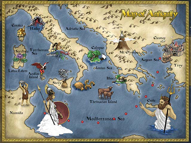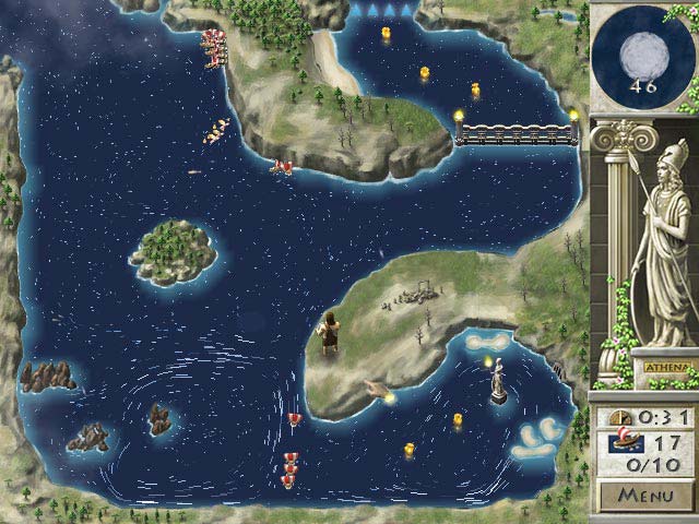 Хитроумный Одиссей из-под стен разрушенной Трои отправился в обратное плавание. Долог и опасен будет его путь домой на остров Итаку к верной Пенелопе. Опасное море, страшные и ужасные чудовища, гостеприимные и коварные хозяева уютных гаваней поджидают его флот. Но мы можем помочь герою: всего-то нужно обеспечить попутный ветер и грамотную навигацию его кораблям. Увеличить силу ветра, значит, щелкнуть мышью в специальное окошко вверху справа. Дальше, не отпуская зажатой клавиши грызуна, начинаем закручивать воронку торнадо. Сила ветра не постоянна, приходится периодически повторять процедуру. Затем нужно задать направление воздушного потока, которое наполнит расставленные паруса кораблей необходимой для движения энергией, и заставит плыть их в определенном направлении. Но не все так просто. Ветер имеет обыкновение разбиваться о скалы и делиться на несколько направлений, по которым понесет незадачливых спутников Одиссея. Хорошо, если рядом нет острых скал, мелей и морских чудовищ - можно вместе со свежим порывом ветра успеть исправить допущенную ошибку. Если трагедия все-таки произошла, то навсегда потеряем один или несколько кораблей. И думай, что главнее: скорость передвижения или медленное, но аккуратное прохождение бурлящих вод. За время пути в навигацию придется вносить поправки и коррективы. Сбор разбросанных сокровищ существенно пополнит счет игры, а некоторые участки моря закрыты толстой цепью, открыть ее может только специальный маяк, расположенный не в самом удачном для мореходов месте. Добавит адреналина и набор чудовищ, среди которых только один Циклоп, разбрасывающий гигантские валуны, создаст серьезные проблемы. Торжествующий рев спасенных ахейцев и счет игры будут наградой морским талантам игрока. Несмотря на интуитивное управление, игровой процесс сложен, многие карты труднопроходимы и легкой игру никак не назовешь. Рекомендуем для спокойствия окружающих "проплывать" не более одной-двух локаций за один раз. Diagnosis: Убить время