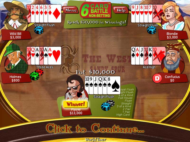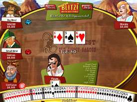 Покер - суть и соль Дикого Запада. Запах легких денег треплет носы многих авантюристов, жажда наживы манит за игорный стол десятки азартных игроков из всех уголков прерий. Но что это? За стол усаживаются играть не бандиты с большой дороги, не цивильно одетые янки, не заносчивые южане, а известные и популярные личности. Элвис, Мэрлин Монро, Эйнштейн, Зорро, Конфуций, Шерлок Холмс, Сирано де Бержерак и многие другие. Просто в новой интерпретации старой игры нашлось место и величию, и страсти, и любви, и вдумчивости, и бесшабашному куражу, и созерцанию, и дедукции, и, конечно, остроумному слову. Тот покер, в который играют собравшиеся знаменитости, немного отличается от обычного. У всех участвующих сторон имеется вся колода из 52 карт (без Джокеров). За один ход (всего шесть на один «банк») в свою руку можно взять любую неиспользованную карту, чтобы собрать одну из нескольких выигрышных комбинаций покера. Если кто-то ранее уже вытянул необходимый кусок пластика определенного номинала и масти, то карта перечеркивается красным крестом и считается действительной только для игрока, первым взявшего ее в руку. Планирование комбинаций и хорошая удача вам не помешают. Во второй и главной составляющей покера - ставках и блефе - необходимо иметь трезвую голову и железные нервы. Начальную сумму можно увеличить постепенно, а можно бросить на игорный стол весь наличный капитал. Глядишь, кто-то из оппонентов проникнется вашей уверенностью и выйдет из игры или, наоборот, последует вашему примеру и останется без гроша. Ставки исключены только в «Блице» - режиме игры, когда на столе есть только одна фишка казино ценой в 10 тысяч долларов. Ее и заберет победитель раунда. Остальные получат лишь небольшие утешительные суммы за собранные комбинации. Кто первый выигрывает оговоренную условиями «Блица» сумму, тот становится победителем. Симпатичная графика, наличие «умных» и знаменитых противников, которые в своей фирменной манере отпускают шуточки и цитаты, неплохое музыкальное сопровождение в стиле кантри, необычный и увлекательный вариант интересной карточной игры - эти козыри «побить» практически невозможно. Diagnosis: Затягивает