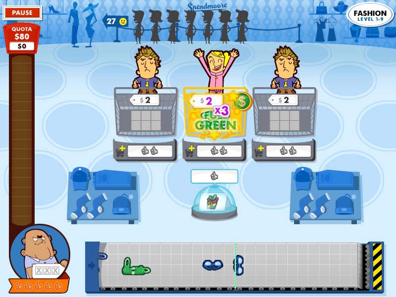 В больших магазинах и супермаркетах от покупателя давно уже ничего не зависит. Помнишь, за чем пришел - не факт, что именно это (и только это) купишь. Тысячи товаров и названий, развлечения и рекламные акции на каждом шагу - разве от всего этого голова не закружится? Только и остается уповать на разумность продавцов, которые, не глядя, сбрасывают на кассе наши покупки в корзину. Таким продавцом вам и предстоит быть. К кассе рвутся десятки покупателей, по ленте транспортера ползут сотни товаров разного содержания и упаковки, но знакомой тетрисоподобной формы. Лишь бы вместились покупки в корзинку клиента, а дальше нам остается только получить деньги и попросить у менеджера для следующего человека тележку размером больше, бесплатных сладостей и небольших сувениров для постоянных клиентов. Торопитесь - нетерпеливые покупатели не любят ждать, а трех скандалов с начальником смены не пережил еще ни один продавец. До конца работы нужно выполнить определенную норму, выраженную в денежном эквиваленте. Бонус зарабатывается за счет полных тележек, товаров одного цвета и скорости обслуживания. Успели - отлично, нет - придется отрабатывать до упора. Пролитые пот и слезы окупятся сторицей. Игрок сделает настоящую карьеру в родном супермаркете $pendmoore. От одежды, игрушек, бытовой электротехники и садовых принадлежностей мы взлетим прямо на этаж дорогих украшений и элитных товаров. Ураганный и скоростной игровой процесс, знакомая сумасшедшая атмосфера больших магазинов, интуитивный интерфейс, симпатичная графика - хорошие поводы взглянуть на эту игру. Diagnosis: Затягивает
