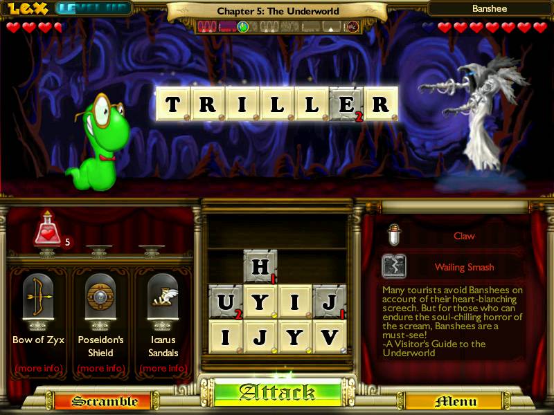«Приключения книжного червя» - сегодня один из самых дорогостоящих казуальных проектов. Больше полумиллиона долларов было потрачено на его разработку. От оригинального Bookworm Deluxe нам остался только набор фишек с буквами английского алфавита. Все остальное кардинально изменилось. Теперь мы не соревнуемся на какие-то абстрактные очки, а защищаем собранными словами собственную жизнь. Просто нашего червяка занесло в увлекательный многотомный приключенческий роман, где ему угрожают разные мифические твари. Составленное слово заменяет нам меч и магические заклинания. Сколько буковок - столько очков жизни отнимем у противника. На каждой локации ожидают словесной дуэли несколько персонажей. Придется, в буквальном смысле, уговорить минотавров, церберов, гарпий, гидру, сатиров и диких животных, которые ожидают нашего появления на палубах кораблей, в подземельях, храмах, лабиринтах и крепостях. За поверженных врагов и длинные слова начисляются очки опыта, что со временем повысит показатели здоровья, атаки-защиты и сопротивляемости. Задача игрока - вывести всезнайку Лекса из очередного подземелья, прихватив на выходе какой-нибудь особенно ценный предмет. С завоеванным артефактом наши словесные аргументы набирают дополнительную силу и червячок легче уклоняется от атак. Есть и дополнительный эффект, который проявляет себя не сразу, а только при выполнении небольшого условия. Например, при использовании определенных букв алфавита. Подтянуть английскую лексику в увлекательной игре с приятной анимацией, интересным игровым процессом и симпатичными персонажами будет одинаково весело и детям, и их родителям. Diagnosis: пожиратель времени
