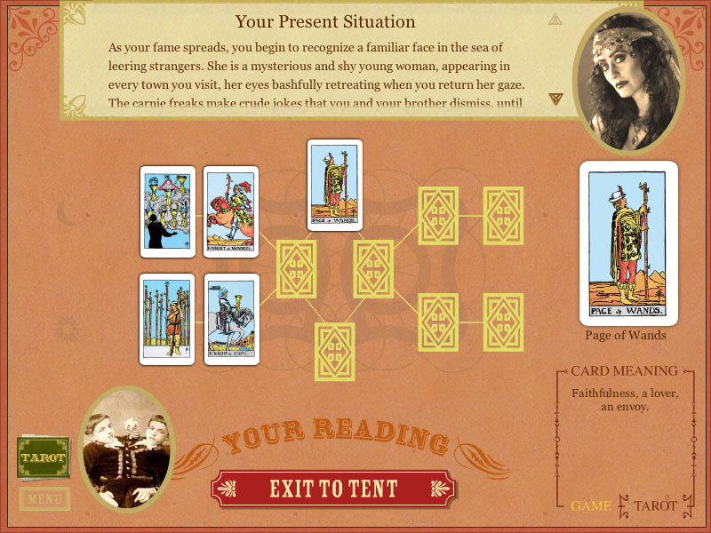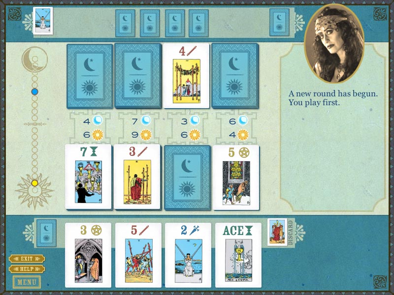 Когда в город приезжает праздничная ярмарка, в балаганах и палатках можно найти множество развлечений на самый разный вкус. Пусть детвора бесится на карусели и жует сахарную вату, пусть публика потешается над мнимыми и настоящими уродцами, а нам надлежит посетить шатер таинственной гадалки. Карты Таро откроют секреты нашей собственной судьбы. Но предсказание - дело долгое. Сначала придется заслужить мистический прогноз и сыграть с гадалкой. Партия идет по сетам, в течение которых на руки выдается всего четыре карты. Их можно положить в разрешенные сектора или сбросить в отбой. На поле - восемь позиций, по четыре для каждого игрока. Суть победы в раунде - захватить и удержать до конца свои позиции и получить жетоны Луны и Солнца. Оппоненты по очереди кладут на сукно карты, разрешается использовать карты либо одинаковой стоимости, или аналогичной масти. Тройка «кубков» (названия и сиволы мастей выдержаны в традиции Таро) перебьет туза или сменит тройку «жезлов». Каждая сыгранная в секторе карта дает +1 балл. По окончанию раунда анализируется ситуация на игровом поле. Если карта осталась лицевой стороной вверх - этому слоту начисляются дополнительный балл. У кого больше вся сумма - получает 1 солнечный или лунный жетон. После выигрыша нескольких партий игроку предлагается вопрос о жизни обитателей ярмарки. Например, какие снаряды должен выбрать жонглер или почему ручной медведь веселит публику. Выбор определяет призовую карту, которая переходит в игровую колоду, и выкладывается в малый круг Таро, что в конечном итоге выльется в финальное предсказание. Правила игры довольно просты и на практике освоение не занимает более пяти минут. Партии идут быстро, а весь игровой процесс немного напоминает нарды. Постоянно доминировать и контролировать всю ситуацию на поле не получается - всегда будет один или два сектора, которые придется уступать или сводить борьбу за них к ничьей. Если представить здешние картежные партии как противостояние света и тьмы, то получится интересный философский вывод о балансе. Игровой процесс не замедлит предоставить доказательства. Diagnosis: затягивает
