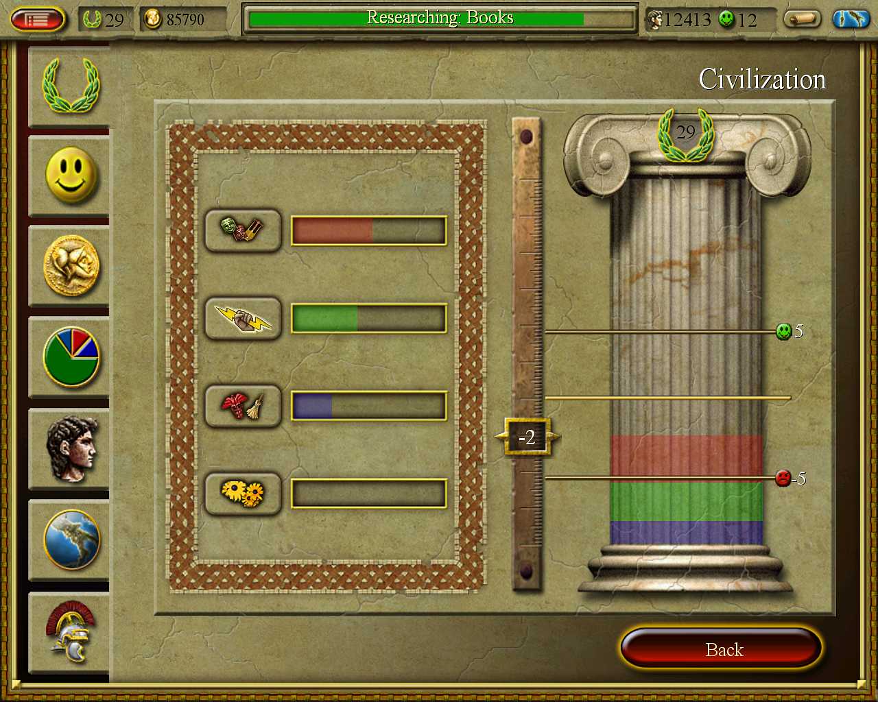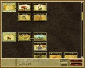 Линейка цивилизации разбита на несколько категорий, чтобы можно было посмотреть, чего не хватает, что можно еще достроить. Интерфейс в целом очень удобен, несмотря на свою громоздкость и допотопный вид. Стоит к нему привыкнуть, и выполнение любой операции производится легко и без лишних телодвижений, точно так же, как и доступ к статистике по городу. Малину портит лишь рудиментарный остаток от Civilization - дерево технологий. Как и в великой глобальной стратегии, в CivCity можно проводить исследования, разбитые по категориям. Ветки не такие большие, но кто-то додумался каждый пункт оформить в виде здоровой почтовой марки, из-за чего на экране находится только малая часть общей таблицы. Исследования, как обычно, увеличивают производственный выход, улучшают качество обслуживания, скорость передвижения по дорогам и прочее. Улучшения значительны, очень облегчают жизнь, но не критичны. Вполне можно обойтись и без них. Здания строятся мгновенно, покупаются только за золото. Несмотря на то, что рабочие добывают дерево, камень и мрамор, стройматериалы в строительстве никак не учувствуют, и ими приходится торговать, отсылая излишек в близстоящие города с караванами и покупая у них необходимую снедь. Остальная часть взаимоотношений построена уже более логично. На фермах выращивают животных, тушки которых разделывают и готовят в мясных лавках. Дерево идет на строительство кораблей, кузнецы берут куски железа и бегут из превращать в мечи, гладиаторы и животные поступают на арены из специальных, разнотипных заведений. Цепочки взаимоотношений коротки и легко прослеживаются, город быстро выходит в плюс, а самой экономикой приходится заниматься очень поверхностно.