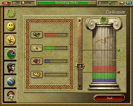 А кампания - дешевка. Если в Stronghold 2 она была обставлена оригинально и динамично, то здесь - это всего лишь набор однотипных миссий, сопровождаемых невзрачными бриффингами. Построй то-то, накопи се-то, улучши тех-то. И после этого приходится начинать строительство поселения заново, выполняя все те же, уже приевшиеся действия. Редко удается продолжить уже начатое и тем более - получить уже готовое поселение, которое необходимо привести к процветанию. Но это, наверное, слишком сложно. Гораздо проще высадить градостроителя на голую землю и сунуть колоду с картами в руки, раз от разу дополняя ее новыми картонками. Как и в любой подобной стратегии, в CivCity приходится строить город, соблюдая баланс, заботясь об экономике и о населении. У хорошего правителя и доход хороший, и население счастливо. Ох, уж эти древние римляне. Вечно им чего-то нехватает. Недовольство может возникнуть по любому поводу - безработица, отсутствие жилья, недостаток питания, распорядок дня, налоги и, самый страшный параметр, уровень цивилизованности. Все эти пункты, так или иначе, регулируются. Правитель создает новые дома, увеличивает рацион, снижает время работы и уровень налогов. А с цивилизацией уже гораздо сложнее. Для того, чтобы ее поднять, приходится идти на поводу у народа, забивать полезные площади парками, храмами, театрами, гладиаторскими аренами, больницами. Уровень цивилизации растет одновременно с городом, население постоянно пребывает (если настроения в городе хорошие), поэтому приходится постоянно строить и строить, удовлетворяя желаниям проглотов.