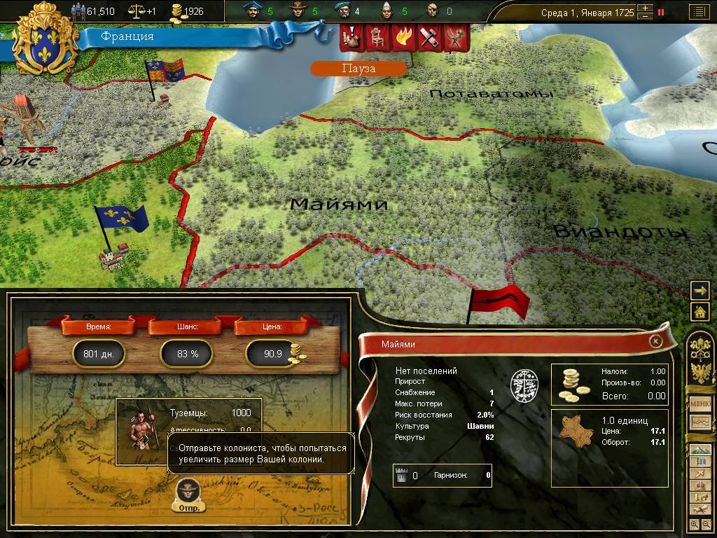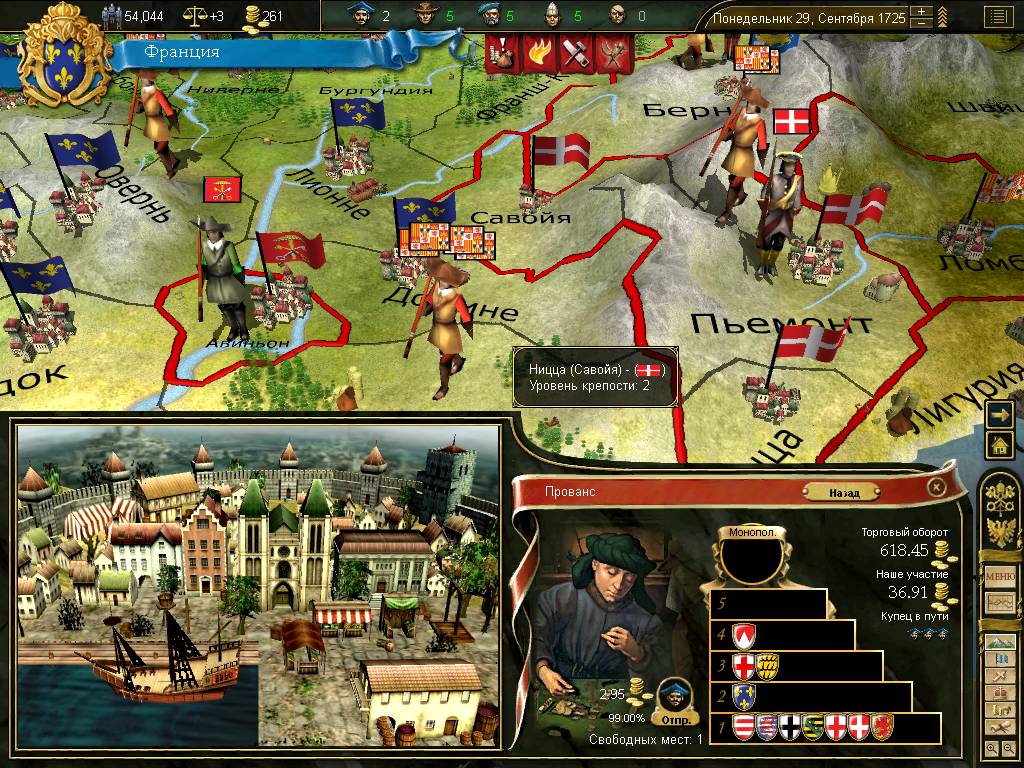 Деньги поступают в казну от трех или четырех источников, главный из которых - налоги. Бездумно понижать или чрезмерно увеличивать долг граждан своей стране элементарно не дадут. Военный налог можно ввести в трудную пору, а облегчить налог - только после ультимативной петиции озверевших жителей. Месячные поступления распределяются между исследованиями и поддержанием стабильности, а годовой доход сразу кладется в казну. Годовой налог намного внушительнее месячного и предназначен для строительства и реализации глобальных планов. Количество золотых монет напрямую зависит от целого ряда факторов. Люди элементарно не будут платить больше, если не удовлетворяются их нужды. Вторая и третья категории доходов - пошлины с произведенных товаров, добыча золота на приисках и прямые поступления от купцов в торговых центрах. Последними, но не лишними будут перечисления от ваших вассалов, щедро оплачивающих собственную автономию. Почти без изменений осталась старая категория игровых фишек - торговцы, дипломаты, священники, шпионы и поселенцы. Все они являются своего рода ресурсом, который потратят в нужное время в нужном месте. Торговцы лично после получения приказа выезжают к конкретному торговому центру для борьбы с конкурентами и захвата монополии. Шпионы помогают чужим мятежникам, провоцируют дезертирство и устраивают покушения на первых лиц государства. Поселенцы денно и нощно укрепляются на незаселенных территориях. Священники обращают паству в государственную религию целыми провинциями. Дипломаты нужны для любого действия на внешнеполитической арене. Все «слуги государевы» - существа одноразовые и при выполнении приказа испаряются. Восполнение этих стратегических ресурсов зависит от множества факторов: личных характеристик правителя, его новых помощников, национальных идей и формы правления. Гораздо большим постоянством отличаются новички в мире Европы - советники. Пока в Цивилизации 4 жертвуют великими людьми в угоду сиюминутной выгоде или в надежде на решающий прорыв в науке, европейцы с руками берут толковых сотрудников на работу. Их служба зависит от постоянного жалования и срока жизни. Помощь для игрока от советников - это не подсказки и красивые графики, а существенная прибавка в одной из сфер жизни государства. Одни значительно (!) двигают вперед науки, помогают реформировать армию и флот. Другие поднимают престиж государства, дают прирост новых дипломатов, священников, шпионов и поселенцев. Появление в правительстве грамотных помощников - один из самых сильных козырей у игрока. Военная сфера претерпела незначительные изменения организационного характера. Все те же три рода войск - пехота, кавалерия и артиллерия. От прежних безликих цифр их отделяет деление на полки, национальные названия (гусары, карабинеры, янычары, стрельцы) и набор характеристик каждого отряда. Строительство очередной тысячи (ровно столько единиц личного состава в EU3 входит в полк) напрямую зависит не столько от золотых монет, сколько от имеющихся в стране свободных рекрутов и текущего технологического уровня. Реформирование старых отрядов - одним щелчком мыши, что, правда, временно отрицательно скажется на моральном состоянии войск. Верфи и корабли отныне разрешено строить только в коренных провинциях, давным-давно захваченных и уми