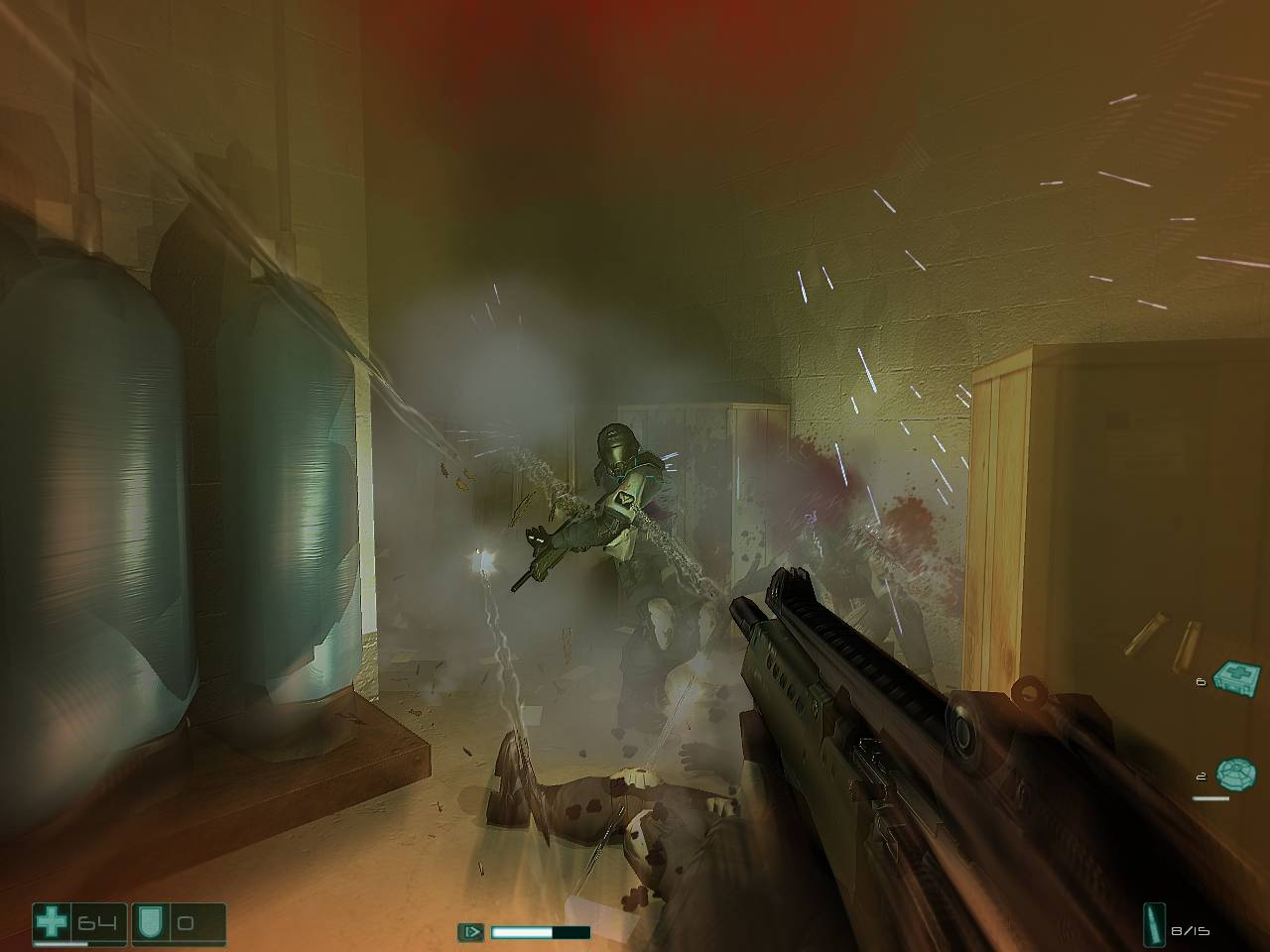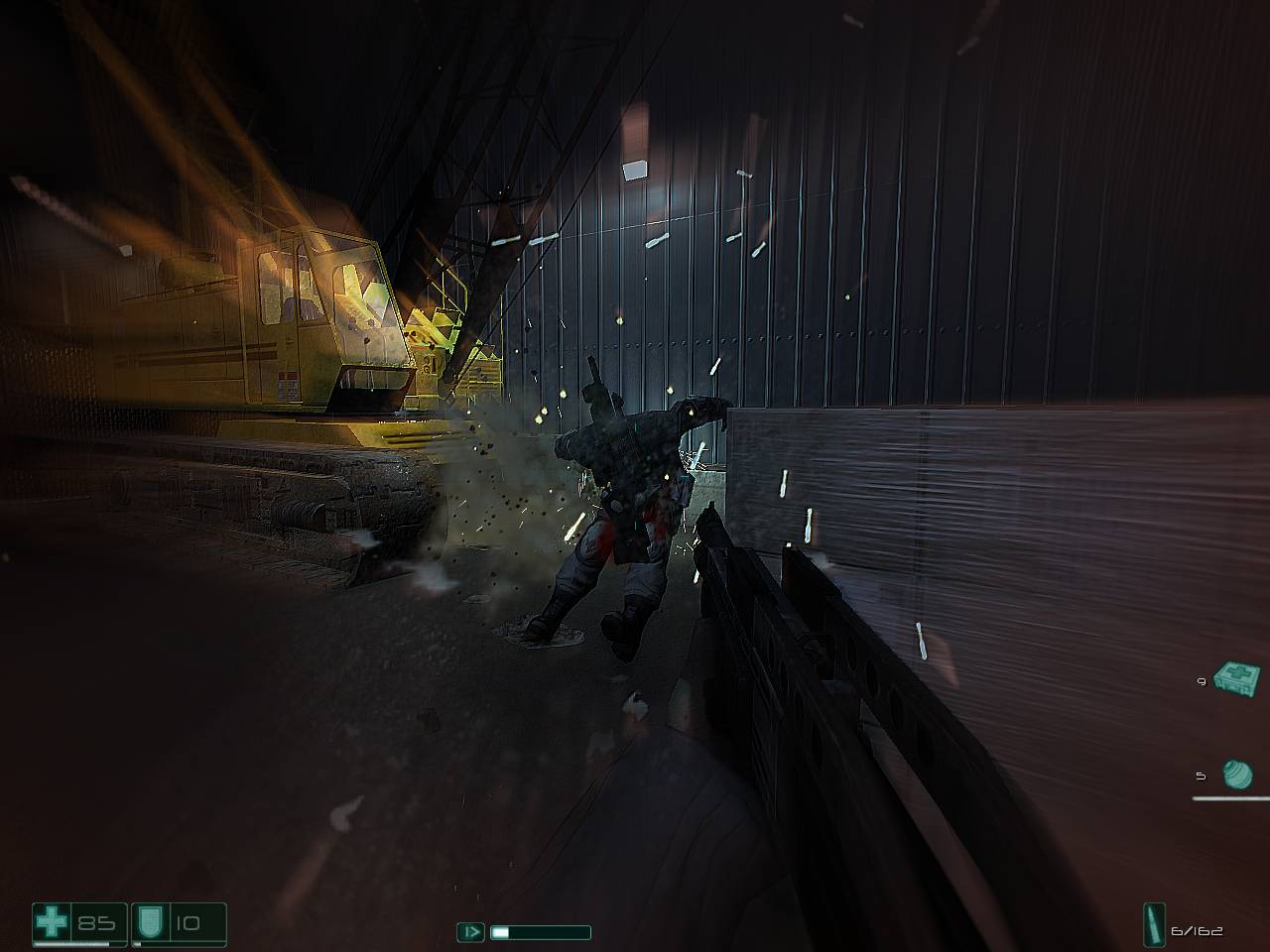«А раньше здесь поворот был направо», «А лестница теперь ведет вниз», «Хм, а вместо бочки тут раньше стояли ящики» - знакомые, доставшие уже антуражи F.E.A.R. преследуют и натирают кровавые мозоли на глазах. Добро пожаловать снова в порт, на склады, в офисы, в канализацию, на крышу, в паркинг, на узкие улочки, в развалины. Те же самые столы, стулья, баллоны, бочки, радио, приборные панели. Только внешний вид компьютеров облагородили по заказу генерального спонсора. Причем, сделано все кое-как, второпях. Ящики - спасительная соломинка ленивых гейм-дизайнеров - здесь распиханы всюду. Арены не продуманы, смышленым клонам просто негде развернуться. Куда им деться, бедным, если их теперь держат на коротком поводке из скриптов, а узкое пространство огорожено стенами. Гибнут быстро и толпами. В оригинале граната едва могла прихватить с собой и одного. Теперь же с ее помощью легко обезвредить двоих-троих сразу.