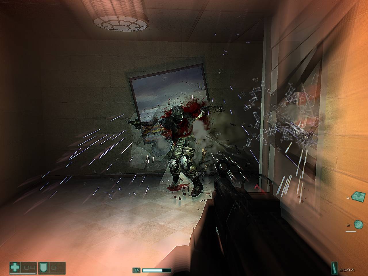 И если пугать у TimeGate Studios получилось лучше всего, то все остальное - из рук вон плохо. Несомненно, им повезло с материалом. Из инструментария F.E.A.R. просто невозможно сделать серую игру. Сверхсообразительные боты по-прежнему дают жару, на стенах остаются глубокие выбоины от пуль, снопами летя искры и осколки, поднимается пыль, кровь льется литрами. Стоит замедлить время, и воздух пронизывается шейдерными трассерами. Эффектно, красиво, стильно. В этом плане F.E.A.R. еще не скоро превзойдут. Но вот по части дизайна разработчики ушли не дальше детсадовской малышни с конструктором LEGO. Они просто разбили оригинальный F.E.A.R. на составляющие и из этого набора собрали собственно Extraction Point.