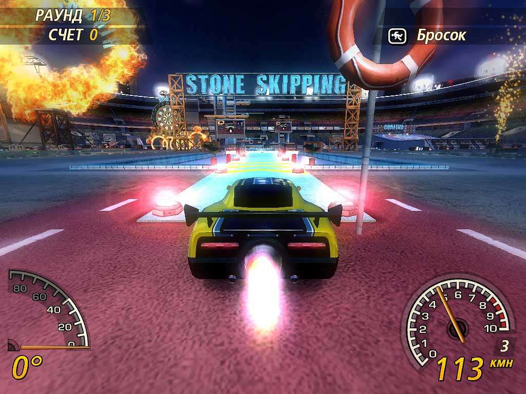 Тем же, кто не мыслит своего досуга без метания гуттаперчевых болванчиков, FlatOut 2 дарит удвоенное количество подобных развлечений по сравнению с первой частью. Катапульта, встроенная в сиденье водителя, с учтивой радостью отправит его на околоземную орбиту, стоит только захотеть. Именно на этом наиполезнейшем свойстве и построены двенадцать абсолютно бесшабашных мини-игр. Принцип прост - разогнаться хорошенько и под нужным углом выпустить водителя в бреющий полёт, руководясь правилами выбранного соревнования. Бейсбол, футбол, баскетбол, огненные кольца - все самые садистские развлечения доступны игрокам с развитой восприимчивостью к чёрному юмору. А если под рукой есть друзья, то классический hot-seat всегда к их услугам. Минимум временных затрат и максимум получаемого удовольствия.
