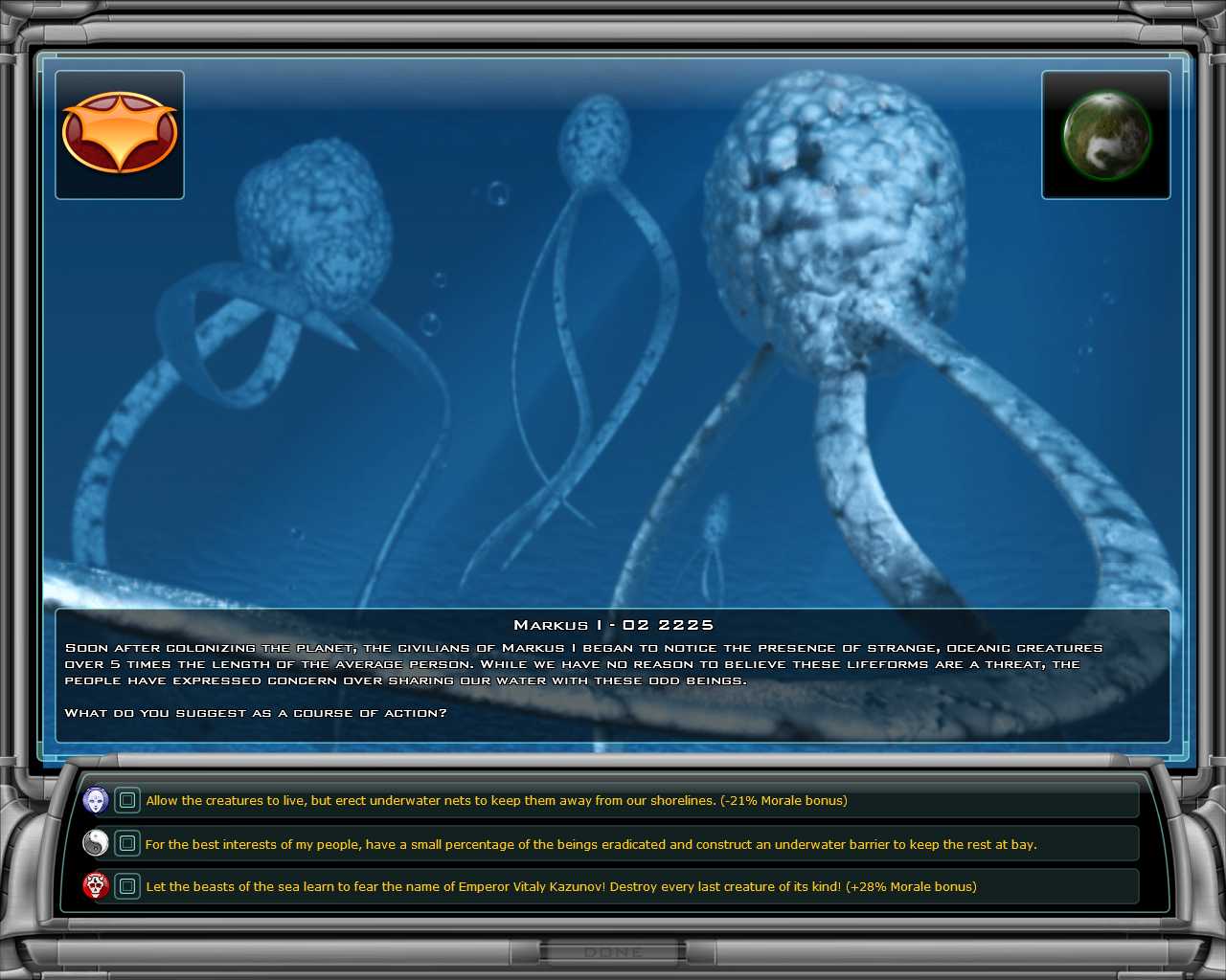 Несмотря на то что прямо влиять на подданных мы не в состоянии, проблемы с перенаселением или их неудовлетворенностью дадут о себе знать. Дело в том, что в игре большое значение имеет показатель «одобрения» (approval). Чем он выше, тем более выгодную с экономической точки зрения форму правления можно будет установить. Поэтому необходимо заботиться о своих гражданах, не давить их налогами, строить развлекательные центры. Если, конечно, не хотите быть жестоким диктатором, от которого родные планеты будут убегать под крылышко другой, более толерантной федерации. Зато никаких проблем с сенатом. Правящая партия одна, нет волнений по поводу выборов. При демократическом режиме приходится уже заботиться о том, чтобы победа в сенате досталась именно вашей фракции — получите замечательные бонусы. Зато проигрыш чреват неприятными пенальти.