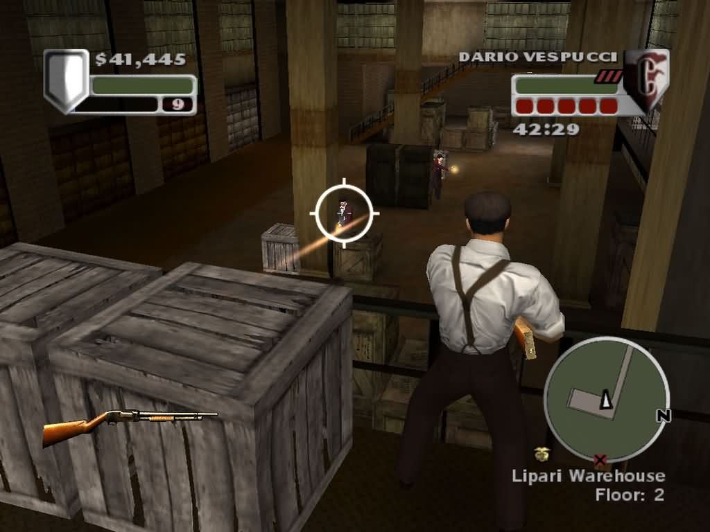 Разборки с конкурентами, как правило, заканчиваются многочисленными жертвами. Очередное убийство члена конкурирующей группировки повышает уровень вендетты - права на кровную месть - вплоть до объявления гангстерской войны на 50 минут игрового времени. Вот тут-то мало не покажется - охотники за головой нашего подопечного вооружатся до зубов, забаррикадируют улицы, оседлают бронированные автомобили. Гонки на выживание прекращаются после убийства всех преследователей или бегства в свой район. Кстати, эту войну можно выиграть элегантным способом: взятка агенту ФБР, и гангстеры будут вынуждены оставить вас в покое. Можно победить и брутальным способом - взорвать родовое гнездо чужой семьи. Архитектура огромного города соответствует Нью-Йорку 40-х. Маленькая Италия, Бруклин, Нью-Джерси, Мидтаун, десятки улиц с «цифровыми» названиями, мосты и скоростные автострады, бульвары, набережные, небоскрёбы, все эти забегаловки, кондитерские, парикмахерские передают в цифровое будущее дух индустриального бума и уют маленьких этнических квартальчиков. Воздух уже пропитывается смогом, по улицам летает бумажный мусор. Город Нью-Йорк (v.1.945) получился большим и … пустым. Мы заходим только туда, где дизайнеры EA посчитали нужным открыть магазинчики, построить склады, спрятать казино и бары, поселить клонированных гангстеров и «резиновых» стриптизерш. Может, из-за этого расставленные под мостами и в подворотнях торговцы стыдливо прячут глаза и предлагают купить патроны и оружие, которые валяются почти повсеместно. Единственная полезность от «черного рынка» - мастера за считанные секунды и небольшую сумму денег модернизируют любой «ствол» нашего арсенала, увеличивая скорость стрельбы и убойную силу пуль. Остальная архитектура 40-х - монолитные стены витрин, заваренные двери, неразрушимые динамитом и бомбами здания. Внутри абсолютно одинаковые интерьеры. Кровати, комоды, коврики, панно и картины, стаканы с недопитой водой и виски стоят на столах в клонированном порядке. На некоторых сюжетных миссиях игра «сжимается» в размерах до небольшого, закрытого со всех сторон коридора. Модели предметов, увы, малополигональны, текстуры на зданиях умеренно размазаны и издалека помогают картонным коробкам выглядеть нормальными декорациями. Модельный ряд четырехколесных друзей огромен и узнаваем: грузовики, бьюики, пикапы, форды, мерседесы, ролс-ройсы, «самолеты» Дженерал Моторс, седаны. Другое дело, как они ездят, сигналят, светят фарами и разрушаются. Управление авто аркадное и интуитивное. Пробитое колесо, смятый в хлам передок с разбитым мотором и радиатором - совсем не помеха для передвижения. Только если авто горит, нужно немедленно его покинуть.