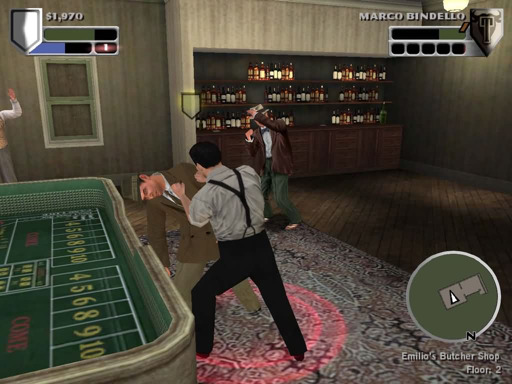 А неприятности на них сыпятся, как из ящика Пандоры. Конкуренты убивают лучших представителей и серьезно ранят дона, жизнь которого нам любезно предоставили спасти в очередной гонке по улицам. Наезд полицейских мешает нормально (по-мужски, с женщинами и ящиком виски) отпраздновать Новый год - опять все улаживать нам. Дети, племянники, старые и новые друзья семьи - всем нужны именно мы. А еще расправы над предателями, убийства свидетелей, саботаж в конюшнях зарвавшегося конезаводчика, грабежи банков, угоны автомобилей. «И такая дребедень каждый день». География влияния каждой семьи не ограничивается каким-либо одним районом. Бизнес у пяти семей Barzini, Cuneo, Stracci, Tattaglias и Corleone простирается далеко за пределами их районов-вотчин. Все серьезные дела лучше проворачивать недалеко от собственной зоны влияния, там же и убежища понадежней будут. Разрываться персонажу приходится между двумя квестами. Хотите лететь, аки птица по сюжету - вперед за синим маркером, болтайте с членами семьи и решайте их текущие проблемы. Решили подкачать уровень, заслужить уважения и насладится десятком красивых добиваний - найдите эмиссара семьи и получите очередной «желтый заказ». Со временем станете толстым бульдозером, готовым к любым неприятностям и проблемам. Залог профессионального роста - в уважении окружающих, так как за каждое выполненное дело нам выдают очки опыта. После набора уровня получаем бонус-поинт, который тратим на улучшение одной из пяти характеристик: fighting, shooting, health, speed, street smart. За этими терминами прячутся: увеличение процента здоровья, меткости, наносимых повреждений, скорости передвижения и перезарядки оружия, уменьшение сумм взяток полиции и степень «зашуганности» бизнесменов. Но не в количественных характеристиках выражаются элементы РПГ, а в полноценном отыгрыше роли. И здесь это есть. Зеленый новичок растет на наших глазах, из хулигана становится гангстером, потом солдатом, капо (бригадир, по-нашему). Делает чудовищный по эмоциональному накалу выбор - остаться на улицах или стать доном семьи, а потом и Нью-Йорка. Главное, что игровой процесс по-прежнему зависит от нас. Рэкет магазинов и ателье, цветочных магазинов и булочных, типографий и мясных лавок, захват баров и складов виски, игорных заведений и борделей, оружейных арсеналов и мастерских - это обычные будни для нашего паренька. Зашел в приглянувшееся заведение, отмеченное на карте знаком конкурирующей семьи. Поговорил с владельцем «по душам». Вежливо одними пальчиками взял его за воротник, легонечко ударил под дых, шутя приложил головой о прилавок или случайно подвернувшийся шкаф - клиент созрел. Да он уже просто рад делиться процентом от праведно-неправедно нажитой прибыли и имущества раз в неделю. Только не переусердствуйте с побоями: некоторые индивидуумы начинают драться не на жизнь, а на смерть. Вышли из здания, а печать семьи Карлеоне на нем не появилась? Вернитесь и проверьте второй этаж, заднюю дверь или подвал. Скорее всего, там прячутся от полицейского взора подпольные казино, публичные дома, стриптиз-бары, склады виски. Здесь вариантов поведения два - выкупить целиком у представителя конкурентов сие доходное место или грубо и ненавязчиво перебить охрану. После чего подойти к здешнему эмиссару и повторить стандартный сценарий. Не переборщите - верность некоторых пе