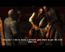 Отдохнуть от перипетий главной сюжетной линии можно множеством разных способов. Или начать поиски разыскиваемых преступников, или помочь шерифу в его тяжелой службе, или заняться доставкой сообщений, или сыграть в картишки, или пасти коров, или пойти поохотится, или отправиться на поиски золотишка. Причем, задания в пределах категории нельзя назвать однообразными. Отличаются ровно настолько, чтобы разработчиков нельзя было уличить в недостатке воображения. Звучит неплохо, играется неплохо, проходится с интересом, ведь за выполнение побочных заданий можно не только потуже набить кошелек, но и поднять свои характеристики. В этом состоит небольшой элемент RPG, кстати. Выполнили миссию фермера - научились ловчее управляться с лошадью, помогли шерифу - подняли боевые навыки. Заработанные деньги можно потратить у торговцев на улучшения имеющегося оружия, состояния здоровья и даже приобрести такую вещь, как нож для скальпирования. Последний, правда, введен по причине «а что бы был». Никакого толку от коллекционирования скальпов нет. Мало того, игра не вносит эти цифры в прилагаемую статистику, куда попадают даже такие мелочи, как количество загнанных лошадей. Ввели для того, чтобы соответствовать рейтингу «самая кровавая игра всех времен и народов»? Скорее всего. Дополнительную сумятицу вносит система сохранений, позволяющая записаться в любое время, но всякий раз относящая игрока к началу еще не пройденного этапа. Вроде бы пустяк, но кошмар начинается, когда все сюжетные миссии пройдены, и всякий раз после загрузки оказываешься в неожиданных местах.