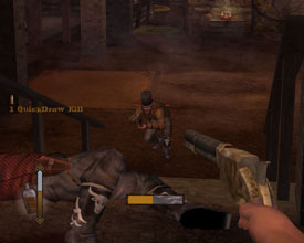 Еще один интересный элемент игры связан с возможностями нашего героя. Он, как вы помните, стрелок. Причем, лучший стрелок на Диком Западе. Для того чтобы отразить это в теле игры разработчики ввели такой интересный режим, как Quickdraw, с помощью которого можно в течение нескольких секунд уложить целую банду, неосмотрительно оказавшуюся на вашем пути. При нажатии на соответствующую кнопку включается вид от первого лица, время замедляется, прицел автоматически наводится на ближайшего противника, остается только кликнуть, чтобы получить нового клиента для гробовых дел мастера. Если в поле прямой видимости от главного героя находится еще один противник, то достаточно нажать вправо-влево, куда указывает стрелка, чтобы курсор автоматически перевелся на него. Просто, как и все гениальное. Необходимо только следить за полосой заполнения Quickdraw, чтобы не попасть впросак во время следующей схватки. Особенно выгодно смотрится этот режим во время конных сражений. Не устаешь любоваться, как тела медленно заваливаются с лошадей и шмякаются в пыльную землю.
