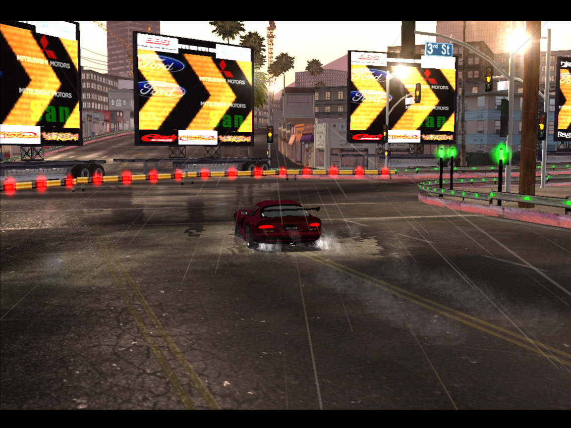 Движок приятно удивляет на редкость высокой производительностью и стабильностью, даже при максимальных настройках. Увы, детальной настройки графики нет, и все регулируется ползунками, вроде track detail или shadows. Присутствует весьма убедительные bump mapping-эффекты мокрого асфальта, очень симпатичные шейдерные лужи (!!!), модельки автомобилей выглядят отлично, особенно хорошо удались отражения на стеклах и хромированных деталях, а также мягкая игра света на поверхности кузова. Приятные эффекты пыли, тумана и дождя, очень красивые ночные гонки. И все это без самоварного блеска NFSU2 и невыразительной корявости Street Racing Syndicate. Поругать можно спрайтовые эффекты фар (никакого динамического освещения, увы), несвоевременное появление «блюра» и плохенькие искры при столкновениях и трении. И умоляю вас — не смотрите на этих ужасных картонных пешеходов с двумя кадрами анимации, представьте, что их не существует. А вот модель повреждений выглядит очень и очень хорошо. Трещины на стеклах, царапины и вмятины на боках, болтающиеся бампера и подпрыгивающие крышки капотов — упрекнуть здесь не за что.