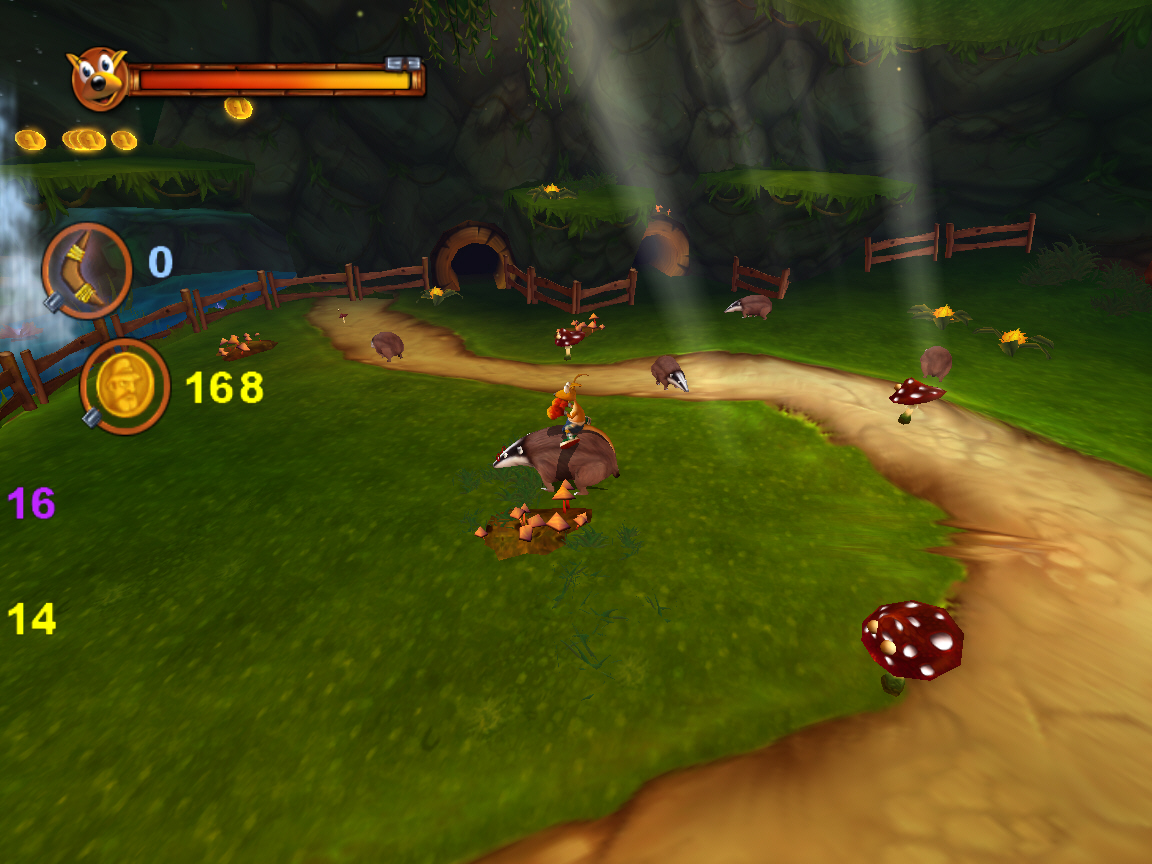 Несмотря на то, что монетки встречаются повсеместно, набрать заветные три тысячи будет непросто. В обязательном порядке уничтожаем все бочки, ящики и урны, невероятными способами проникаем в секретные области, а также не брезгуем фиолетовыми кристаллами, которые открывают доступ на дополнительные уровни, где, как нетрудно догадаться, тоже есть чем поживиться. Точки сохранения в виде колокольчиков расставлены не всегда удачно, кроме того, случайно утонув в реке и будучи отброшенным к последнему чекпоинту, наш герой вынужден снова топать до места своей бесславной кончины и по второму (третьему, четвертому, десятому) разу вступая в потасовки с чудесным образом возродившимися монстрами. Одно благо — никакого счетчика «жизней» в игре нет и пресловутый Game Over нам не грозит. Пожалуй, со временем правила стали значительно мягче даже для аркад, кроме того, можно сохраняться и по ходу игры, правда, в этом случае будет засчитан последний активированный «колокольчик».