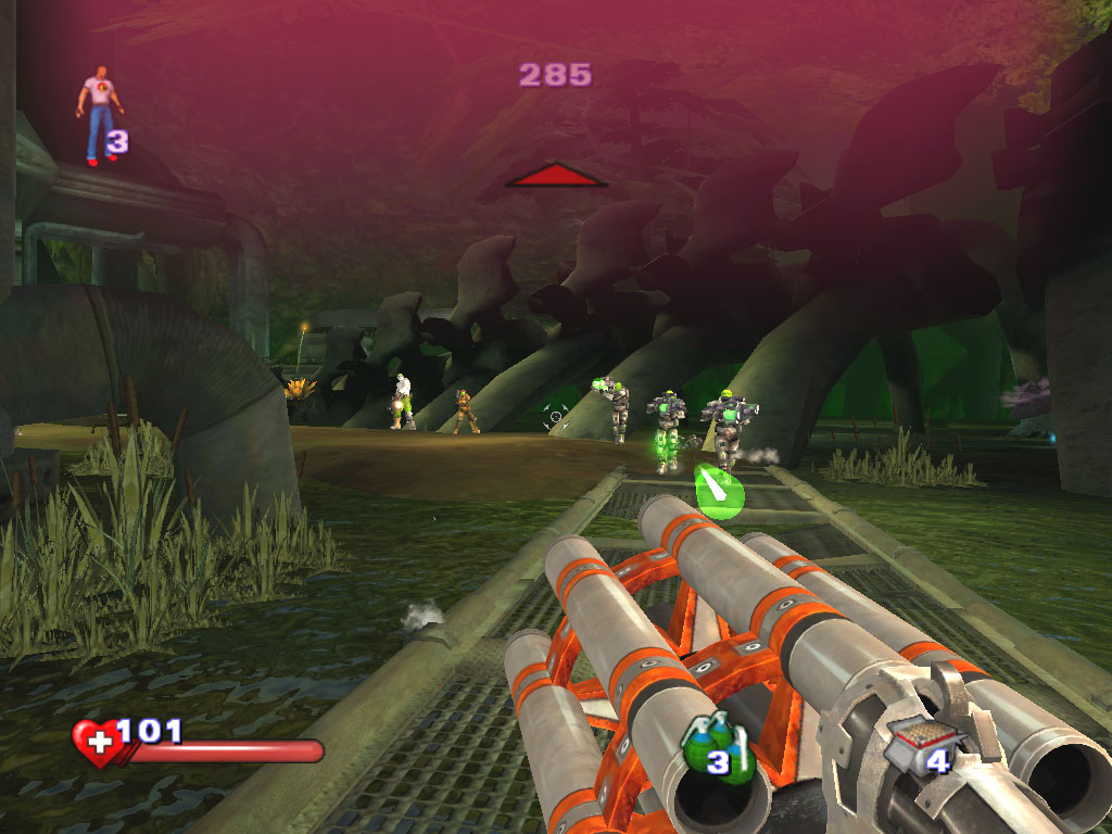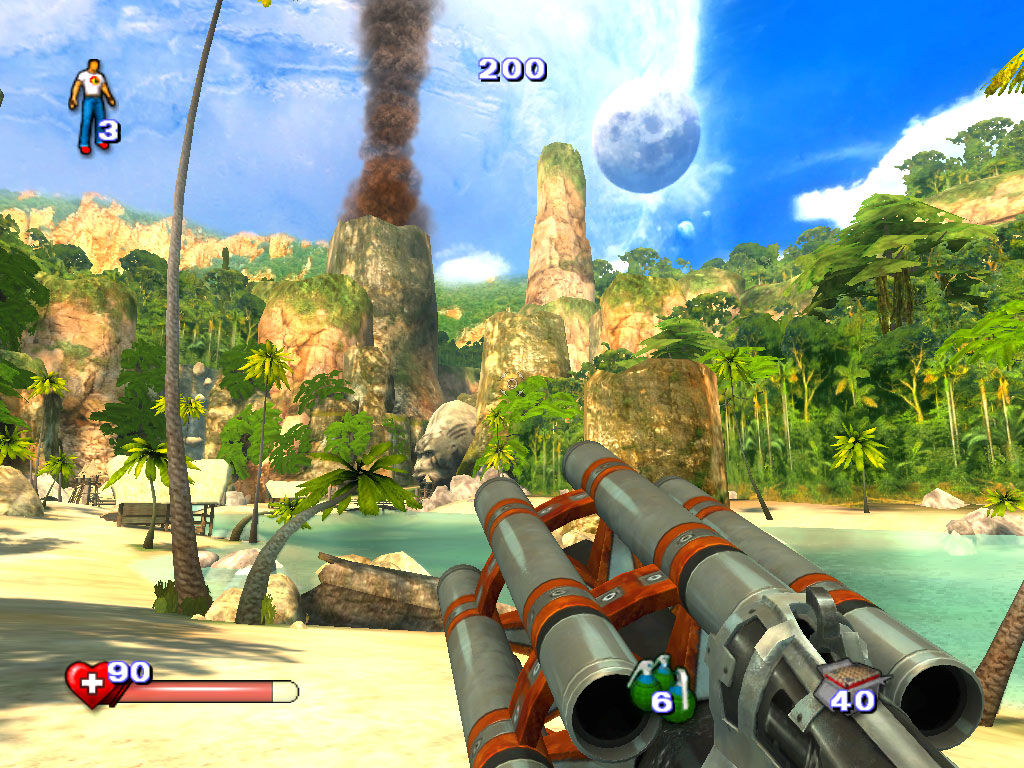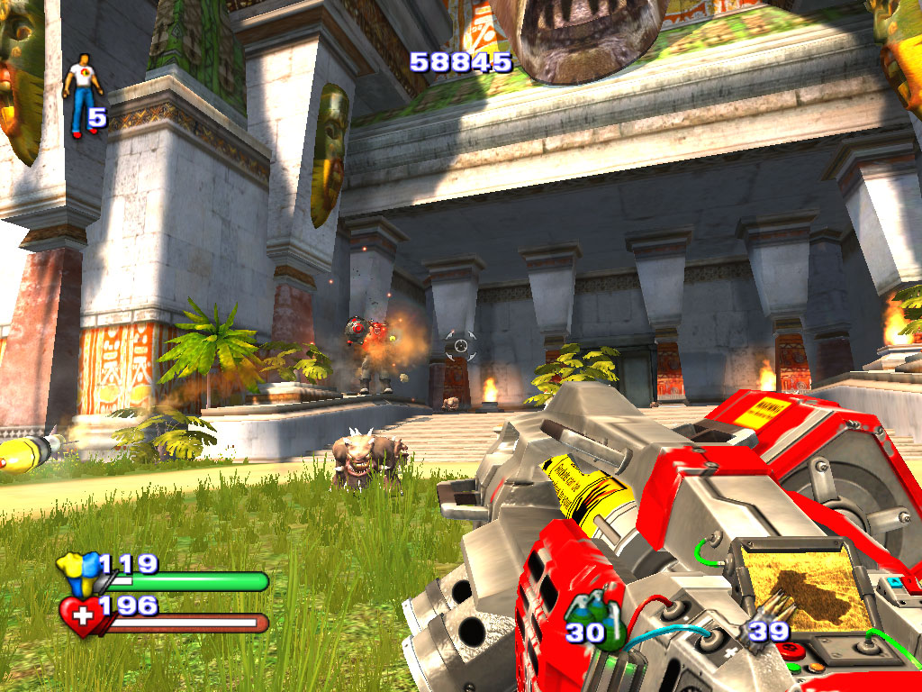 Секретные места на уровне, о которых мы тоже говорили в обзоре демки, в большинстве случаев выглядят не такими уж секретными. Спрятанный за завалом бочек бронежилет оказывается местом секретным. Плавающая на плоту Serious Bomb – тоже. Иногда, впрочем, встречаются и более оригинальные идеи. Например, выбиваемая из курицы аптечка, или прячущиеся в ящиках монстры. Закономерный вопрос: для чего, собственно, нужны эти секреты? Ответ прост: для восстановления запасов жизни/брони и набора очков. Также как и в первой части и аддоне The Second Encounter, набор условных единиц идет за убийства монстров, сбор всяких рулезов, монеток и т.д. За каждые 20.000 очков вручается дополнительная жизнь. Да-да, число респавнов теперь ограничено – в левом верхнем углу экрана изображена пиктограмма Сэма с цифрой, указывающей количество оставшихся респаунов. Вкупе с полноценной системой сохранений, эта особенность выглядит странно. В любой момент можно нажать спасительную клавишу F6, а при каждой смерти нажимать F9 и продолжать игру с места сохранения, имея все тот же запас очков, здоровья. При респавне же с потраченной жизнью игра начинается с последнего чекпоинта (да, он тоже есть!). Кому, спрашивается, нужны эти консольные "фишки"? Похоже, их не вырезали из РС-версии.