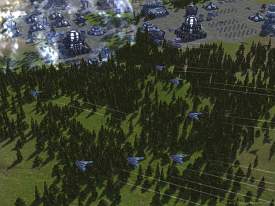 Отдельной графой стоит игровая физика. Если упавшим и протаранившим танк истребителем сейчас никого уже не удивишь (камикадзе не перевелись даже в 29-м веке), то возможности лесных массивов нигде ещё так детально не использовались. Во-первых, потасовка на лесной опушке выглядит почище любого Ватерлоо: взрывы оставляют недетских размеров воронки, в воздух вверх корнями летят деревья, осыпается комьями земля... Романтично, особенно учитывая вероятность возникновения лесных пожаров, от которых достанется «и вашим, и нашим». Играют леса и другую роль, особенно в мультиплеерных дуэлях. Из-за наличия в SC полноценного fog of war, территории «прорисовываются» на карте постепенно, в соответствии в радиусом обзора ваших юнитов-разведчиков. Самыми удобными для «проявки» игрового экрана традиционно являются воздушные юниты - в основном из-за их скорости и хорошей обзорности. Под покровом леса мелкие юниты будут просто незаметны летающим «соколам». А с тяжёлой техникой ситуация уже не такая радужная - игрок всегда сможет вычислить в каком направлении ушли войска соперника, просто проследив их путь по поваленным деревьям. Интересно, будут ли в игре роботы-садовники, восстанавливающие лес после прошедшей армии? Время покажет.