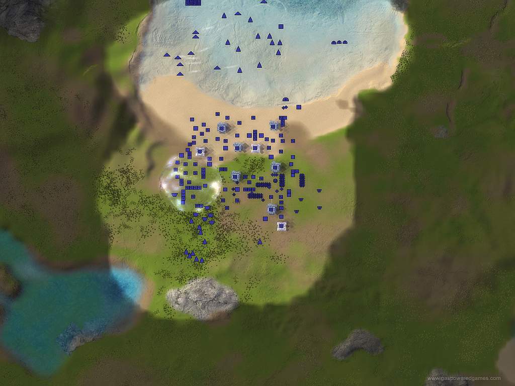 В Gas Powered Games, не долго думая, застолбили столь звучное словосочетание как «Theater of War» в качестве собственного игрового ноу-хау. Сам «Театр Войны» представляет собой тот самый «стратосферный» вид, о котором упоминалось в начале статьи. Однако дело здесь не только в высоте расположения камеры над землёй. Именно в таком режиме наиболее удобно наблюдать сразу за НЕСКОЛЬКИМИ очагами локальных стычек. Указывать прибывающим отрядам наиболее оптимальные маршруты подхода. Организовывать адекватное снабжение транспортами. Перебрасывать силы из одной точки в другую. Определять наиболее подходящее место для ядерного удара. И так далее, и тому подобное.