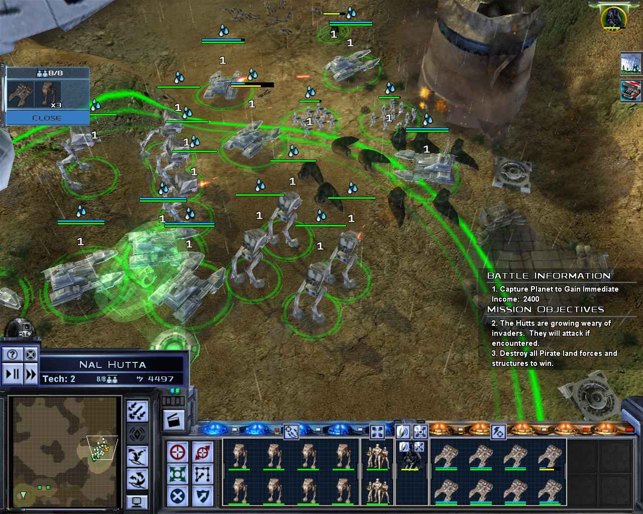 Любое столкновение, будь оно орбитальное или наземное, вызывает появление вопроса: самим разгромить противника, или отдаться на волю калькулятору, который, как обычно, подсуживает противной стороне? Поэтому советую пользоваться им лишь при существенном преимуществе. Хоть сражения в большинстве своем и решаются "куча на кучу", ручное управление позволяет обходиться без жертв там, где компьютер обязательно потеряет пару АТ-АТ.