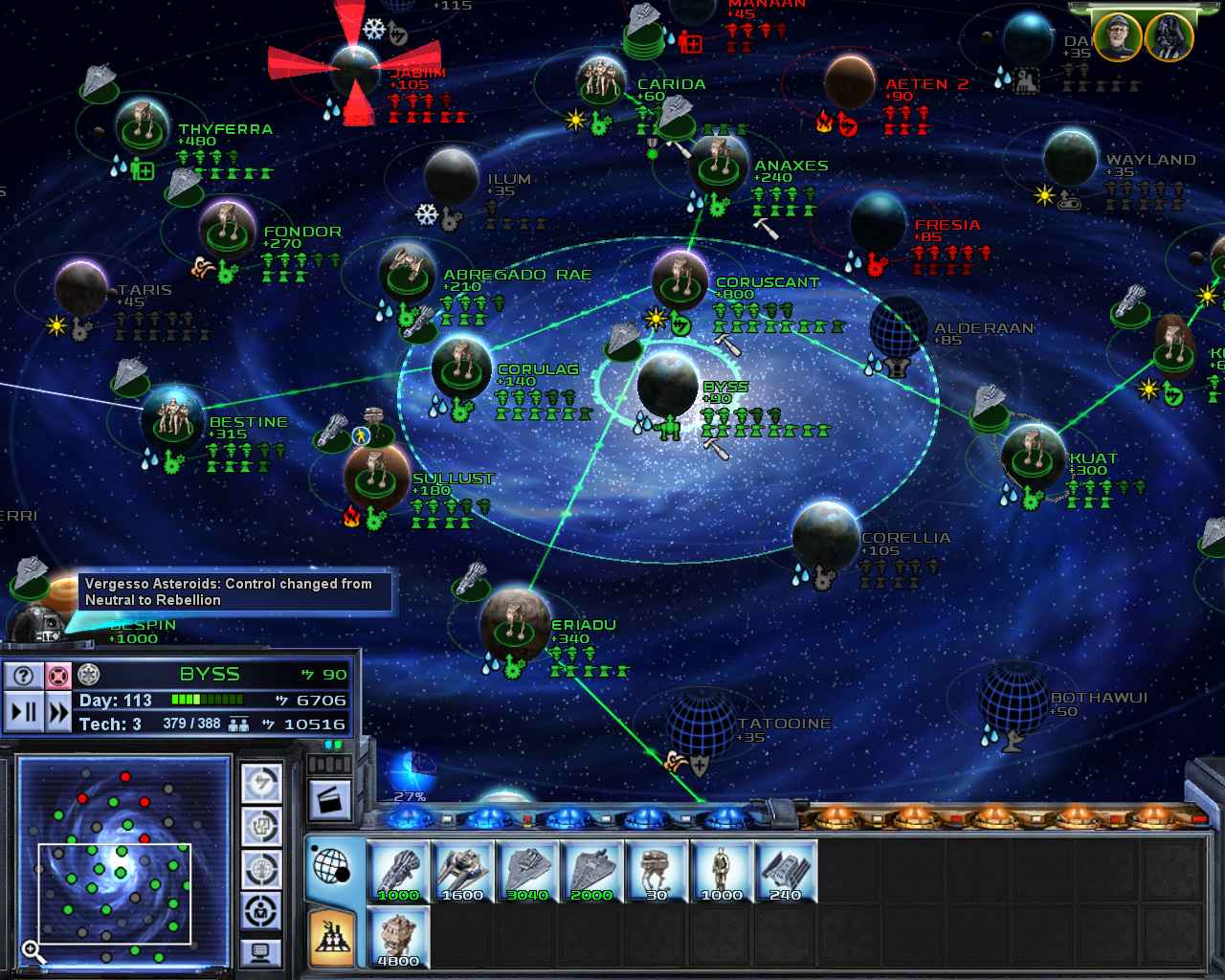 И здесь стоит, наконец, оговориться. Empire at War - это далеко не RTS, как считают многие, разглядывая сочные скриншоты. Компания Petroglyph использовала RTS составляющую в качестве легкомысленного макияжа, который искусно скрывает под собой серьезное лицо глобальной стратегии. Именно глобальной, подразумевающей одновременное управление множеством планет и армий. В этом режиме происходит основное, самое важное действо: разведка сил противника, шпионаж, воровство ресурсов, строительство наземных баз и орбитальных станций, штамповка флота и техники. Планеты в галактике существенно отличаются друг от друга по ряду параметров. Количество приносимого дохода, место для строительства инфраструктуры, погодные условия, влияющие на наземные сражения. Во время дождя или пылевой бури, например, эффективность армии существенно снижается. Дополнительно некоторые планеты обладают, что называется, глобальными бонусами: все Stormtroopers получают + 35% к здоровью, танк T4-B получает дополнительный 25% бонус к атаке. Нет глобальных бонусов - получите частные: строительство техники стоит дешевле, наземные базы невидимы для противников, доход от планеты существенно выше, чем у других.