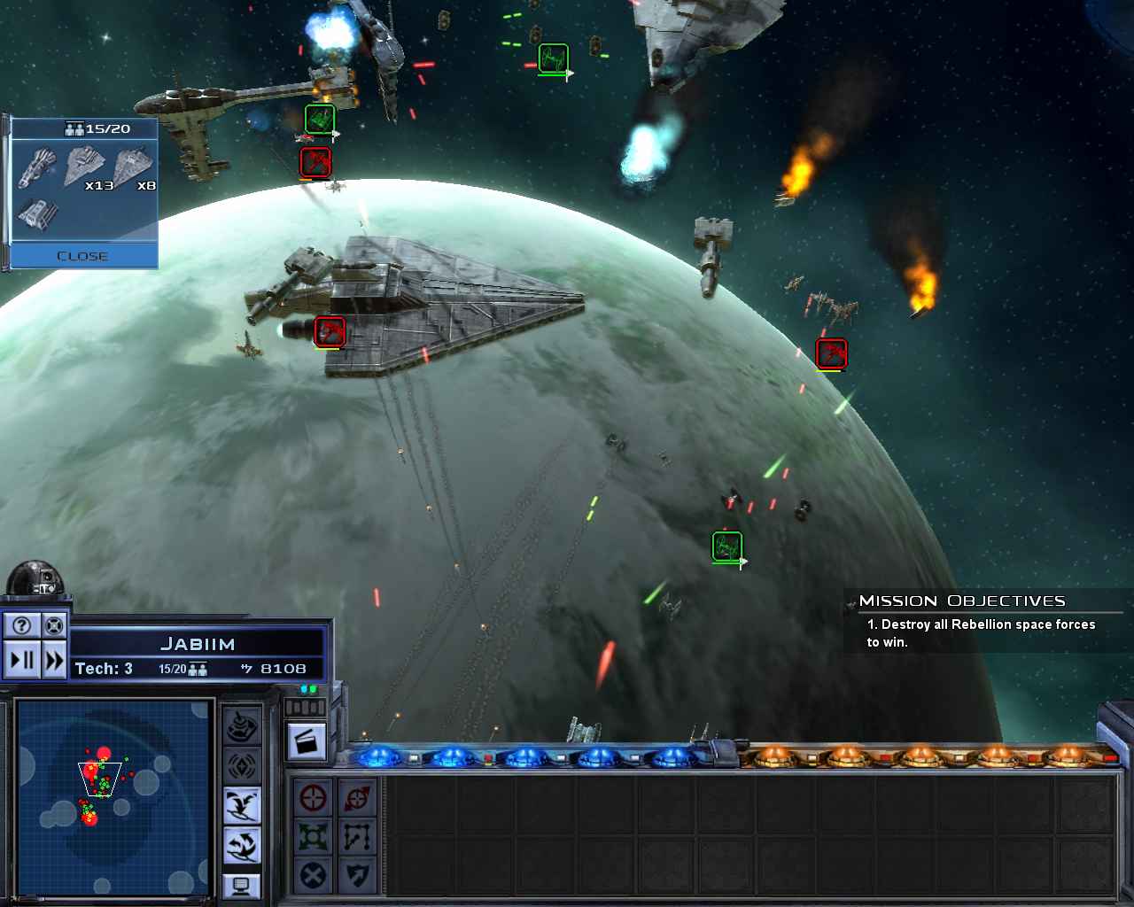 Захват планеты проводится в два этапа. Сначала космический флот штурмует орбиту, а потом уже не землю уходит десант, чтобы уничтожить строения и живую силу противника. Только, сколотив неподъемную для противника армаду, вы не сможете прокатиться ею по всей галактике, без труда уничтожая местечковые сопротивления. Проблема в том, что разработчики с целью соблюдения баланса поставили жесткое ограничение на присутствие кораблей в системе планеты, а вместо погибшего разрешили вызывать подкрепление из оставшегося флота. Из-за этого противнику никто не мешает сражаться с вами на равных. Само собой, большой флот все равно победит - просто задавит постоянно прибывающими свежими силами. Но и его пощиплют основательно. Особенно во время штурма орбитальной станции, ощетинившейся лазерными турелями и постоянно штампующей звенья X-Wing'ов.