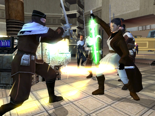 Существует устойчивый стереотип: серьезные ролевые игры и приставки — вещи несовместимые. Исключение — JRPG, игры со своей спецификой, по ряду причин не поддающиеся портированию на PC. Компания Obsidian Entertainment сумела опровергнуть эту аксиому — вышедшая в прошлом году Star Wars: Knights of Old Republic, несмотря на консольное прошлое, стала лучшей RPG (а по мнению многих изданий и лучшей игрой) 2003 года на PC. Опыт прошлых лет (а за плечами сотрудников BioWare такие культовые проекты, как Baldur's Gate и Neverwinter Nights) помог сделать великолепную мультиплатформенную RPG, сочетающую в себе глубокую сюжетную линию и мощную ролевую систему с аркадными элементами и простотой управления. Вселенная Star Wars, как оказалось, идеально сочетается с AD&D третьей редакции, а тот факт, что действие игры разворачивается задолго до событий, известных по фильмам, снял со сценаристов большинство сюжетных ограничений и условностей. Заранее уверенные в успехе, разработчики еще до выхода оригинальной игры успели поручить компании Obsidian работу над продолжением. Несмотря на двойку в длинном названии, The Sith Lords, скорее является большим адд-оном, нежели полноценным сиквелом. Движок подвергли самым незначительным изменениям — печальная дань мультиплатформенности, ведь в X-Box новое железо не поставишь. Эпохальных изменений нет и в геймплее, впрочем, обо всем по порядку. Заправлены в планшеты космические картыИгравшие в первую часть помнят, что конец игры полностью зависел от избранной игроком стороны. Светлые джедаи, повергнув Дарта Малака и уничтожив Star Forge на время откладывали уничтожение вселенной, в то время, как радикально злой персонаж сам становился Темным Лордом со всеми вытекающими отсюда последствиями. Дабы не возникло сюжетных несостыковок и злые герои, как это обычно водится, не остались в обиде разработчики решили дать игроку возможность самостоятельно выбрать предысторию. Скорее всего, на дальнейшие события этот выбор повлияет не сильно, но пиетет будет соблюден, все останутся довольны. Галактика в панике, Дантуин лежит в руинах после атаки флота ситхов, орден джедаев частично уничтожен, а оставшиеся в живых уволены за некомпетентность. Таинственный Дарт Реван — главный герой первой части бесследно исчез. Да, нам придется расстаться со своим старым героем и поселиться в шкуре ветерана Мандалорианской войны, джедая в изгнании, потерявшего связь с Силой. Судя по всему, пересечений с KoTOR ожидается минимум, из всех старых планет обещают только Дантуин, да и то в полуразрушенном варианте (надеюсь, что дама, предававшаяся плотской любви с роботом, и два семейства враждующих олигархов, выжили). Старых знакомых, скорее всего, мы встретим, но в ограниченных количествах — таким образом, исключаются дурацкие случаи, когда покойные персонажи чудесным образом возрождались в сиквелах. Исключением, пожалуй, будет дроид Т3-М4, обитающий в недрах корабля Ebon Hawk. Собственно, с обнаружения "Ястреба" и начинается экспедиция по поиску уцелевших джедаев и Ревана, за компанию. Цель — возродить былую славу ордена и заняться насаждением мира во всем мире. Это для оптимистов. Хорошие RPG всегда отличались гибкостью в отношении мировоззрения персонажей, а KOToR и вовсе уравнял в правах "добрых" и "злых". Добропорядочным гражданином всегда быть проще, зато злодеем — намного интереснее и, часто, выгоднее. В соотве