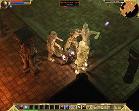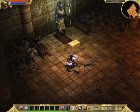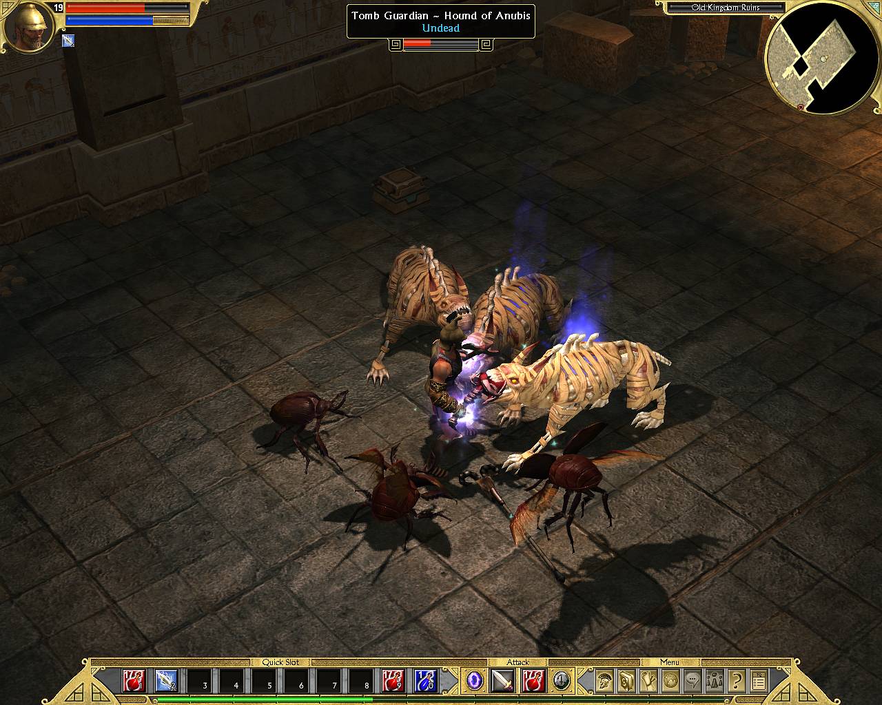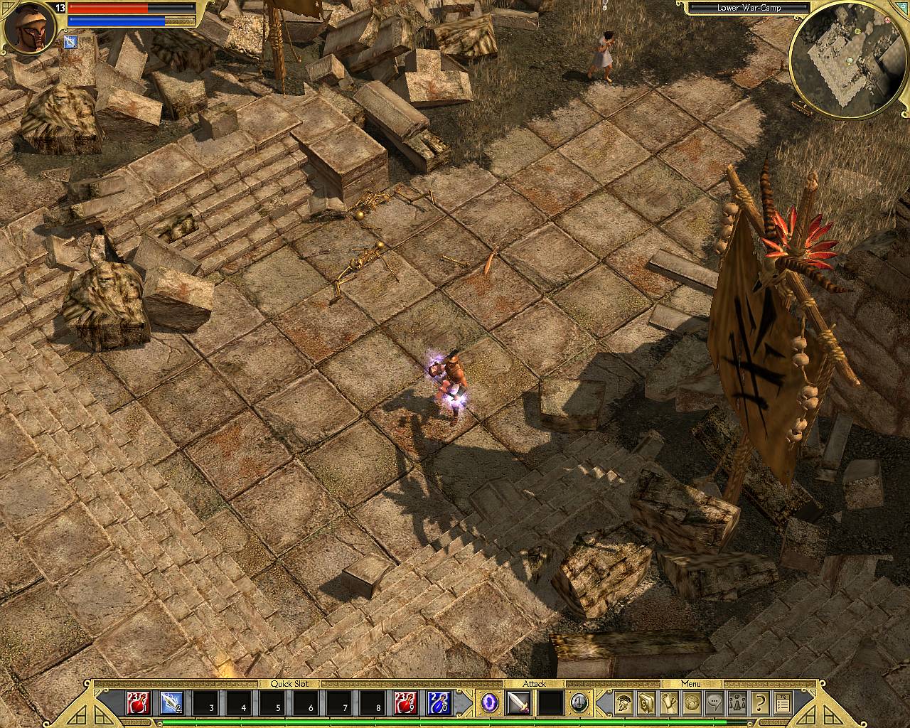 Выпадение предметов в TQ впервые в истории жанра имеет под собой логическую основу. Из противников выпадает только то, что на них реально одето и ничего более. Из волка никогда не выбить броню или, тем паче, мешок золота. Неандертальцы, сколько их не ковыряй ножиком, не уронят на землю греческий шлем. Кентавр с луком ни при каких условиях не выронит меч по одной простой причине - его у него нет. Зато все «узаконенные» вещи падают в избытке рядом с тушкой поверженного монстра. Для простоты ориентирования, при нажатии клавиши Alt подсвечиваются только более-менее приличные предметы. Остальное барахло можно подобрать, но стоит оно сущие гроши, а места в сумке занимает порядочно. Это потом, когда благодарные жители подарят еще несколько мешков, можно будет не обращать внимания на случайно подхваченный хлам - места не жалко. Для простоты экипировки, при наведении курсора на новоприобретенный предмет, выскакивает не только окошко с его свойствами, но и еще одно, с показателями надетой. Очень удобно для сравнения их параметров.