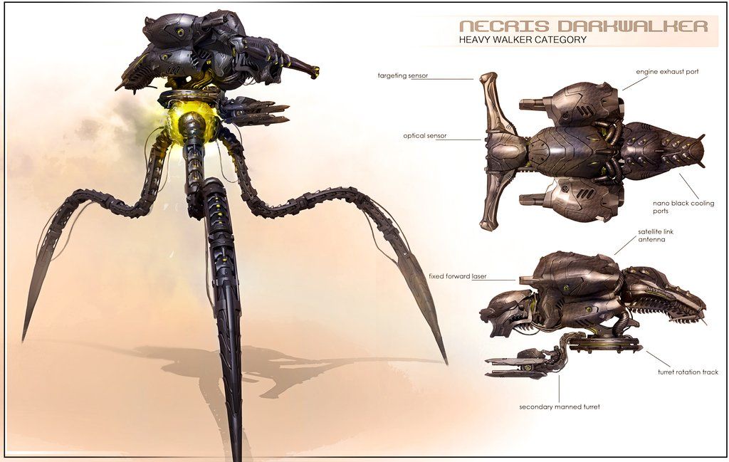 Центральное место в списках бронетехники Necris занимает заочный любимец публики - его величество Dark Walker. Эта трёхногая конструкция напоминает одновременно и страйдера из HL2 и пришельцев из недавнего эпика «Война Миров». Dark Walker оборудован мощной лазерной пушкой, стреляющей короткими очередями, и очень эффективен против бронетехники. Кроме того, конструкция ног позволяет ему «приседать» в случае необходимости, и быстрее всех остальных танков взбираться на холмы и возвышенности. Минус у этого красавца только один - во время стрельбы скорость передвижения сильно падает, что делает его лёгкой мишенью для вражеской бронетехники.