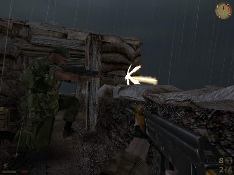 С другой стороны всей этой красоты видится умело скрытая, но, тем не менее, присутствующая и временами дающая о себе знать графическая «блеклость» игры. Ну, прежде всего, модели достаточно низкополигональные, постройки и наполнение уровней также не отличаются гладкими контурами. Все это приводит к тому, что игра легко и без проблем идет на многих конфигурациях, но владельцы хорошего, передового «железа» будут разочарованы «простоями» мегагерцов и мегабайтов. К тому же, периодически возникают проблемы с так называемым «clipping'ом» трупов, когда они проваливаются в стены или друг в друга, но на открытых пространствах тела ложатся хорошо, правильно повторяя контуры подстилающей поверхности. Музыкальное оформление порадовало не только темами, сопровождающеми игру (кто смотрел соответствующие фильмы, наверняка, найдут немало знакомых мотивов), но и прекрасным звуковым сопровождением. К примеру, озвучка персонажей очень близка к идеалу: они живо разговаривают, во время сражения отпускают весьма недурственные фразы, «Чарли» тоже активно лопочут на своем языке. Уровни полны всевозможных звуков будь то звук текущей воды или треск цикад, шум дождя или птичьи голоса. Шаги настолько распознаваемы, что даже с закрытыми глазами можно определить по какой поверхности (суше, воде, камням, дереву или траве) ступает в данный момент герой. ![]() На достаточно высоком уровне оказался и искусственный интеллект. Тут стоит отдельно обговорить поведение своих и чужих бойцов. Свои бойцы, то есть представители отряда специального назначения, прекрасно тренированные бойцы почему-то очень плохо стреляют. Соотношение убитых вами и ими врагов может составлять десятки, если не сотни раз. С одной стороны это старнно, с другой было бы неинтересно, если бы врагов убивали только ваши компаньоны, а не вы. Так что такое соотношение считаю правильным, хотя оно и идет вопреки общему реализму игры. Члены вашего отряда зачастую следуют и прикрывают вас самостоятельно, радист прибегает, как только вам приходится связываться с базой, медик автоматически лечит, если находится по близости с раненными. Больше всех меня разрдражало только поведение проводника: он настолько медлительная фигура, что временами, когда не знаешь куда идти, хочется выстрелить в Nhut'a, чтобы тот пошевеливался. ![]() Как враги, так и соратники грамотно выбирают позицию для стрельбы, прячутся за укрытиями, перебегают с места на место, убегают от брошенных гранат, применяют порой неожиданные маневры. Бороться с ними очень интересно и не надоедает, но иногда в их тактике бывают серьезные «пробелы», когда они бегут навстречу и погибают под пулями одни за другим. Кроме того, сильно сказывается влияние расстояния на «зоркость» и «ум» бойцов. Можно издали расстреливать вражеских солдат, а они даже не дернутся и не примут ответных мер.