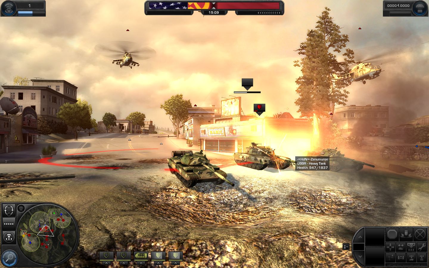 Во-вторых, добавляется объемный свет от солнца. Этот эффект сейчас принято называть God Rays, поскольку его реализация сильно напоминает картины на библейскую тему с пробивающимися из-за белоснежных облаков лучами света. В World in Conflict под DirectX 10 это как раз и можно наблюдать. Причем, в динамике - и никогда еще свет от солнца в играх не выглядел так красиво. ![]() В остальном разницы нет. Разработчики, правда, утверждали, что реалистичное поведение дыма появляется только под DirectX 10. На практике в демо-версии он вел себя и выглядел одинаково под любым API. Текстуры, модели, вода, поведение растительности, взрывы - все то же самое. Однако и пары перечисленных эффектов достаточно, чтобы сделать картину под DirectX 10 приятнее. Переходить на DirectX 9 после увиденного не хочется. При великолепной графике игра отличается завидной производительностью. Количество настроек огромно и позволяет запустить игру с приемлемой скоростью почти на любом игровом компьютере. Приятно, что одновременно с графикой разработчики хорошо поработали над игровой механикой, позаимствованной из Ground Control 2. В принципе, у Massive получилась третья часть этой уникальной тактической стратегии, только декорации других миров сменили на Америку 90-х, а инопланетян - на Красную Армию, которая всех сильнее. Сюжет игры повествует об альтернативном витке в истории холодной войны между США и СССР, когда Советский Союз в 1989 году неожиданно высаживается в Северной Америке и начинает в лучших традициях Red Alert выжигать напалмом и ядерными боеголовками загнивающий Запад. К сожалению, в кампании придется играть только за американских вояк, которые в очередной раз защищают своего «фридома». К счастью, в мультиплеере можно принять любую сторону и повернуть местечковый конфликт в пользу Страны Советов - в многопользовательский режим перетекают все карты из одиночной кампании. World in Conflict – не совсем обычная стратегия, поскольку в ней не приходится добывать ресурсы, строить базы, управлять большим числом солдат. В мультиплеере она тем более не похожа на своих товарок, приближаясь по игровой механике, скорее, к онлайновым шутерам из серии Battlefield. Единовременно на одной карте могут состязаться 16 человек – по восемь на каждую из воюющих сторон. Нет необходимости ждать начала матча – игрока сразу вбрасывают на поле боя, и он принимает участие в уже действующей битве. Только надо определиться с ролью (профессией). ![]() В игре существуют четыре «роли» в зависимости от типа подчиненных: Infantry (пехота и легкие виды техники), Support (артиллерия и противовоздушная оборона), Armor (танки и прочая бронетехника), Air (вертолеты). В рамках каждой профессии приходится единовременно управлять небольшой группой из пяти-шести единиц. Универсалов тут нет – у каждой есть сильные и слабые стороны, и победа может быть достигнута только общими усилиями игроков. Заказываются солдаты через Reinforcements Menu, и через несколько секунд после этого новеньких вояк сбрасывают на поле боя в выбранной заранее точке. Но за все необходимо платить. В данном случае, войска приходится покупать за специальные Reinforcements Points. У каждого игрока их строго определенное количество, поэтому он может заказать только ограниченное число техники или солдат. Например, после потери одного танка, его стоимость возвращается в банк, а на эти деньги можно заказать себе новый. 
