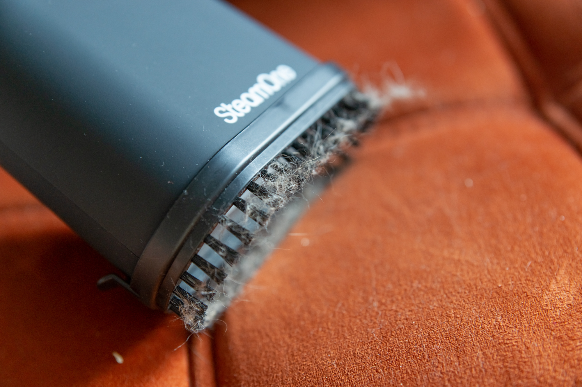 Что учесть? Многие ручные отпариватели предназначены только для вертикального отпаривания, и в горизонтальном положении подача пара у них блокируется. Так, например, получилось при попытке почистить от шерсти кресло при помощи ручного отпаривателя SteamOne EUFD80B: с щеткой он отлично справился с очисткой вертикальных поверхностей — или если мебель перевернуть. К сожалению, сиденье дивана или массивного кресла почистить таким образом не удастся. Слишком мягкие щетки не справляются с чисткой текстиля от шерсти.
