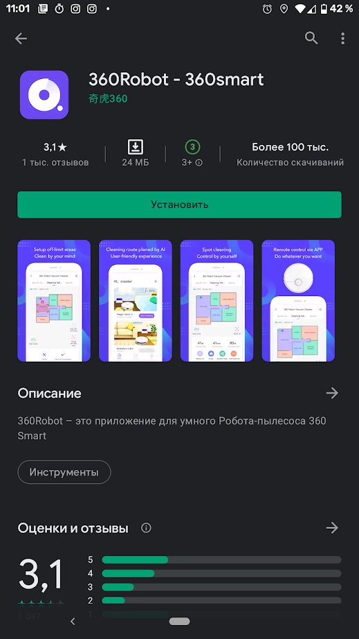 Для управления роботом-пылесосом следует скачать и установить приложение 360Robot (на момент написания обзора более 100 тысяч скачиваний, средняя оценка — 3,1).