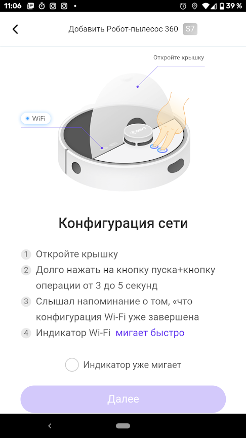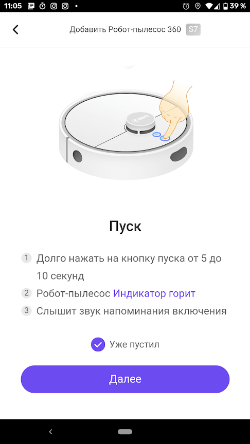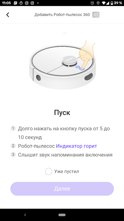 Процедура синхронизации пылесоса с мобильным приложением несложна. Вначале следует включить устройство длинным нажатием на кнопку питания. Затем одновременным длинным нажатием на обе кнопки управления включается режим подключения к сети Wi-Fi.