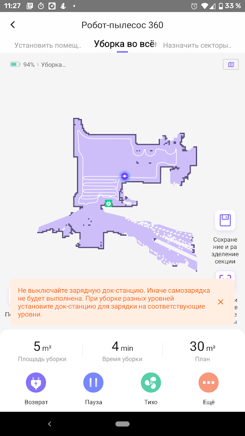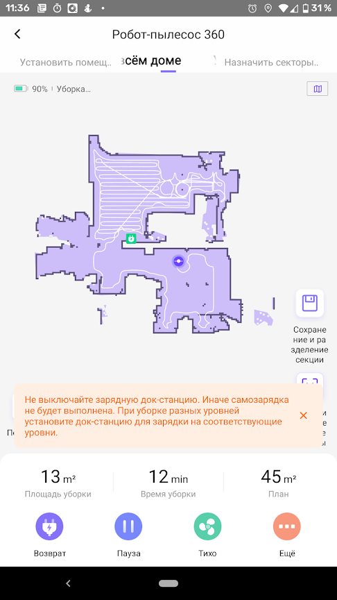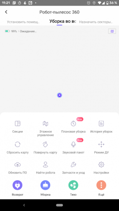 Если в процессе работы заряд аккумулятора падает до минимальных 20%, робот прерывает уборку и отправляется на базу. После того, как батарея зарядится полностью, задание будет возобновлено с той точки, где оно приостановилось. Но если к этому моменту начал действовать режим «Не беспокоить», уборка начнется только следующим утром.