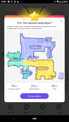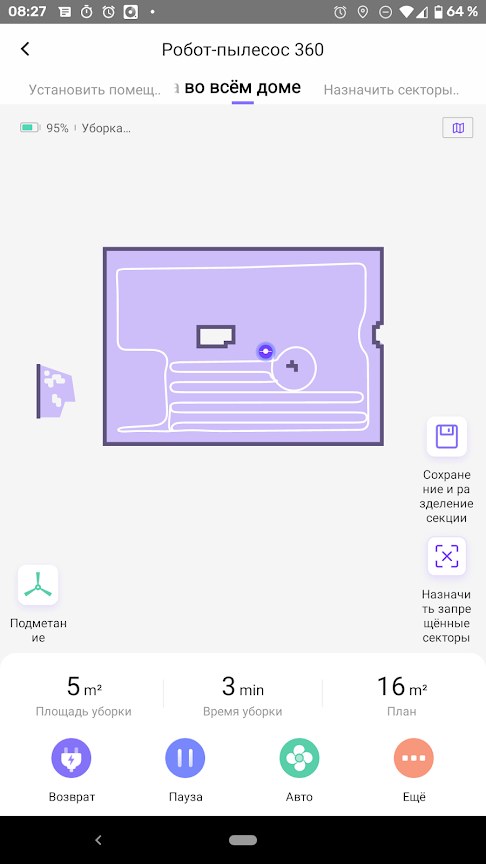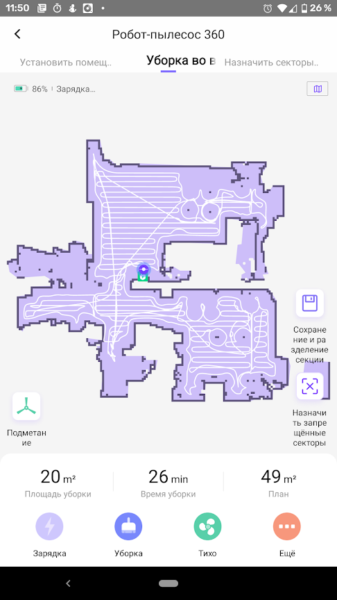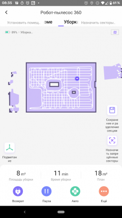 Можно приступать к первой уборке. Через пару минут после запуска приложение рисует весьма точную карту помещения. Стены и крупная мебель изображаются на карте белым, доступная для подметания площадь показывается сиреневым. Белая линия отмечает пройденный роботом путь.