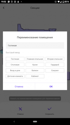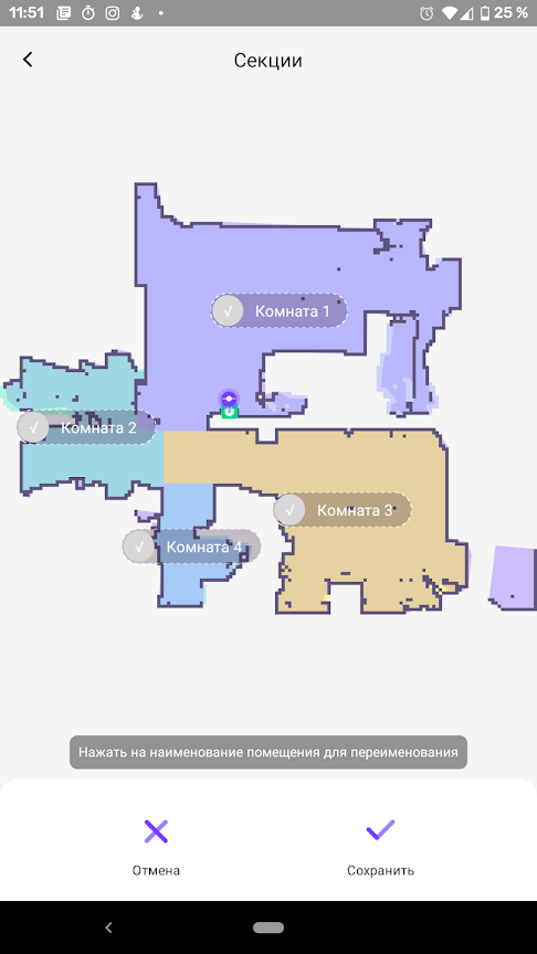 Комнаты на плане можно переименовать, используя предустановленные шаблоны, и нанести на карту участки для уборки по секторам. Внутри одного сектора можно устанавливать тщательность подметания (указав, к примеру, что для уборки кухни следует пройти по ней два раза, а в гостиной достаточно и одного прохода).