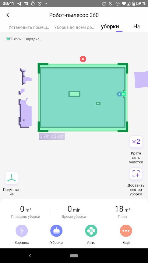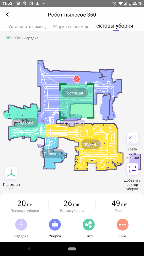 Перед началом тестов мы позволили пылесосу минут пять прогуляться по полигону, чтобы ознакомиться с планом помещения и конфигураций препятствий. Затем вернули его на базу, нарисовали на карте сектор с двукратной очисткой и запустили прибор в автоматическом режиме.