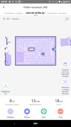За десяток минут к нашим услугам была подробная карта помещения, которое убрал пылесос, а меньше чем через полчаса 360 S7 отрапортовал о завершении уборки и вернулся на базу. После этого приложение предложило нам отредактировать схему квартиры, разметив ее по собственному усмотрению.
