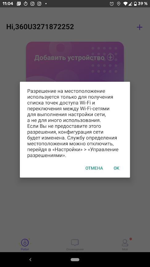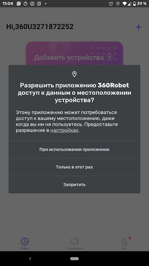 Перед выбором модели пылесоса необходимо принять еще одно разрешение — на доступ к местоположению. Рекомендуем согласиться.