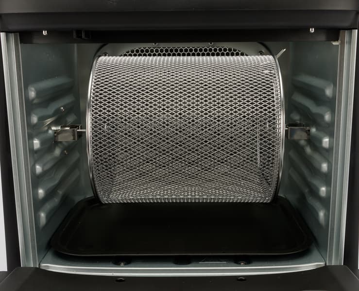 Аэрогриль больше похож на мини-печь или мини-духовку, однако главный принцип аэрогриля — компактность в сочетании с мощной конвекцией здесь соблюдается. Комплектация аэрогриля поражает: и вертел, и решетки, и противень — можно готовить на двух уровнях, и шампуры для мини-шашлыков, и вращающаяся корзина для овощей-фри. Таким образом, устройство действительно способно заменить духовку, но не только: еще и фритюрницу, дегидратор, йогуртницу.