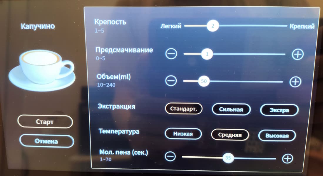 Рецепты можно сохранить в памяти, предусмотрено 6 аккаунтов пользователей. Кнопка «тест» позволяет оценить вкус приготовленного только что напитка и отредактировать рецепт перед сохранением.