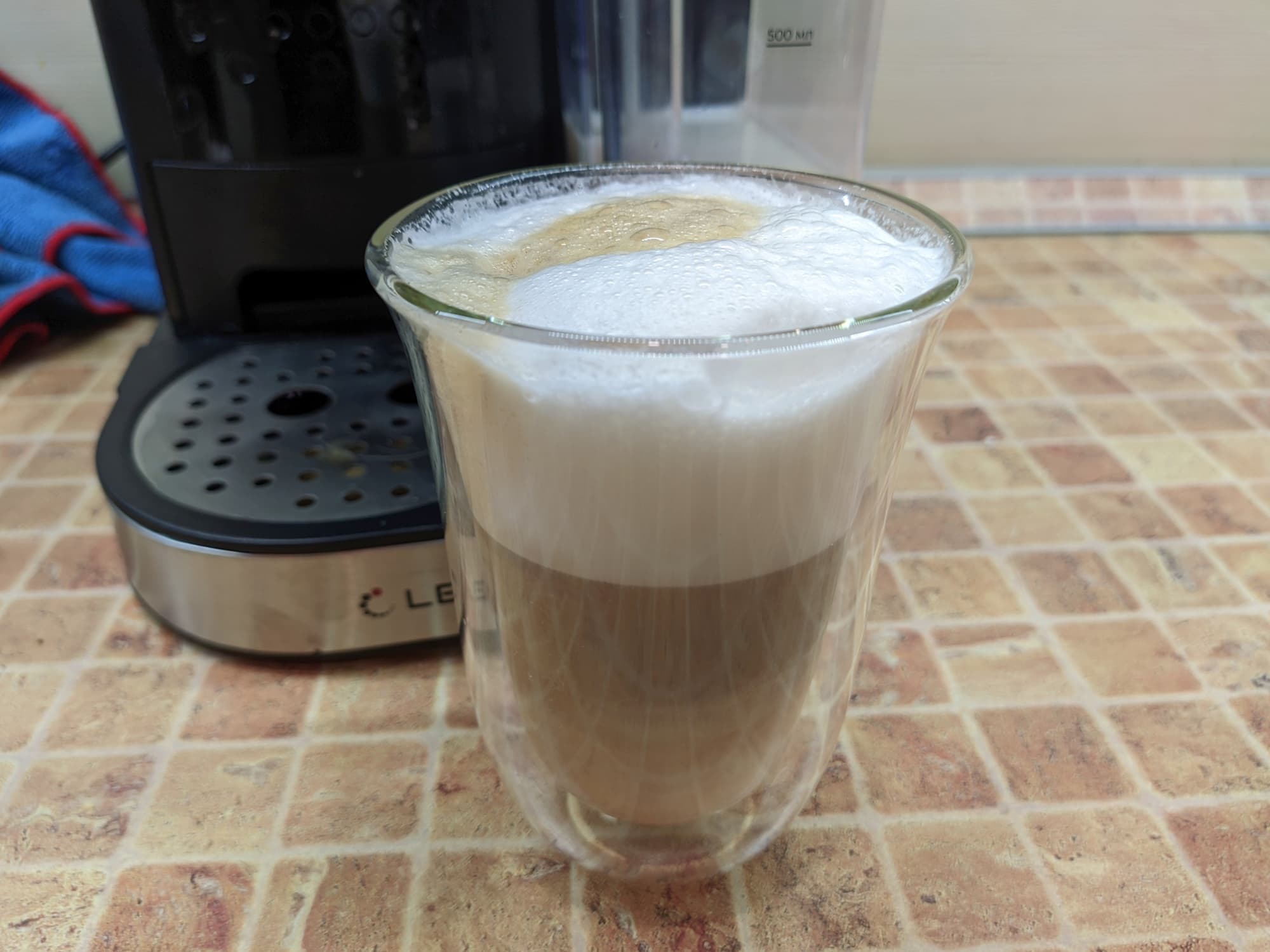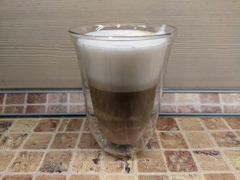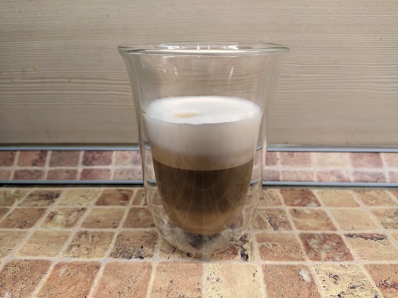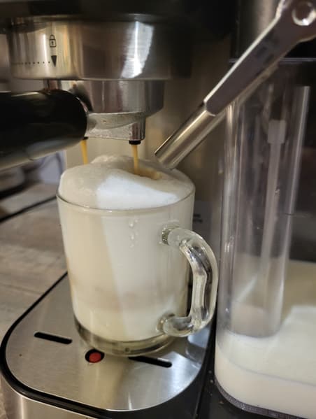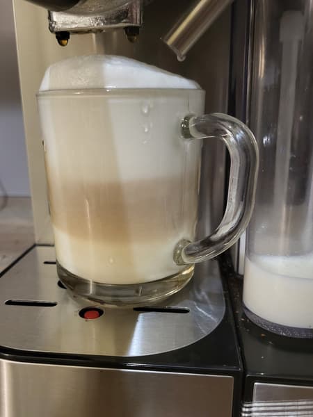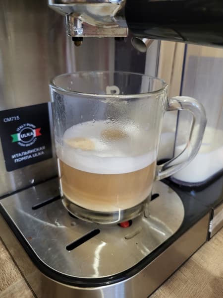 К сожалению, кофеварка готовит и латте, и эспрессо одинаково — сначала молочную, а затем эспрессо. Разница лишь в объеме молока (для латте больше). То есть по сути это два латте макиато с разным объемом молочной пены.