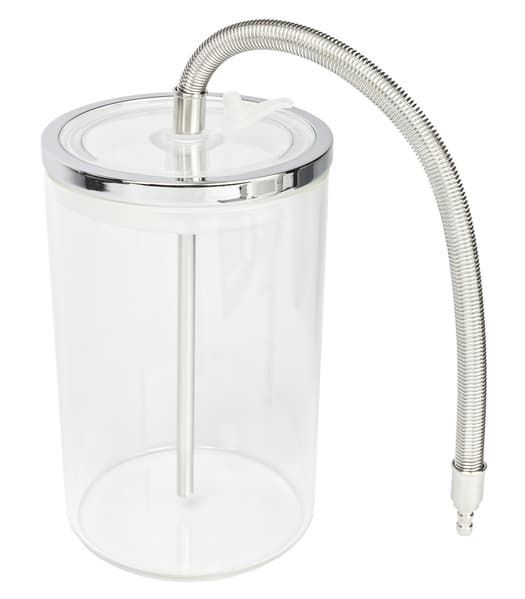 Сам молочник объемом 700 мл — бюджетная (с пластиковой трубкой) версия автоматических кувшинов-капучинаторов кофемашин. Сверху у него расположена ручка регулировки наклона трубки подачи пены, спереди — переключатель подачи молока/молочной пены.