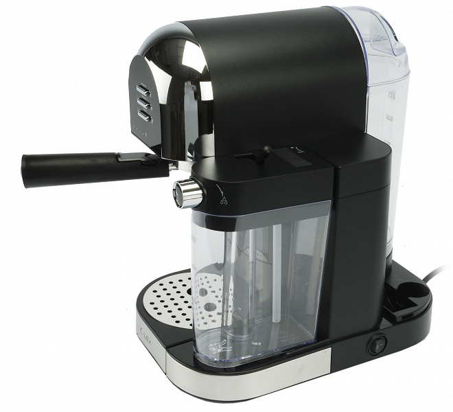Рожковая кофеварка «без рожка» (интрига, читайте обзор!) средней или чуть выше средней ценовой категории имеет кувшин-капучинатор на 400 мл, который подключается к прибору через съемный пластиковый переходник. Кувшин можно в любой момент отсоединить. Молоко подается в капучинатор через пластиковую трубку, вспенивается внутри крышки кувшина и подается через раструб прямо в чашку. Угол наклона раструба в этой модели не регулируется. Есть и ручной капучинатор (правда, мы не поняли, зачем).