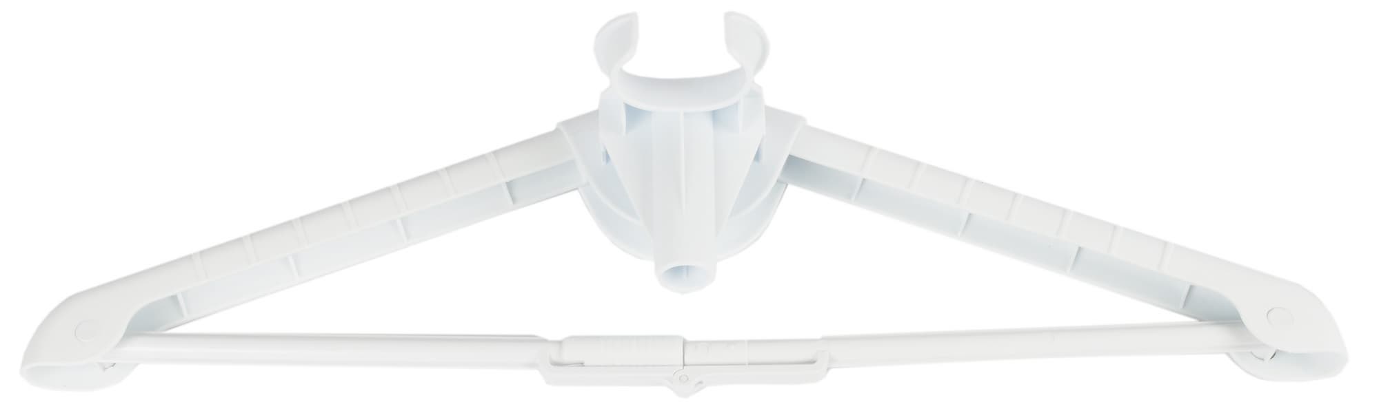Нам понравилось качество сборки: прибор не хлипкий, фиксаторы очень крепко сжимают металлические трубки вертикальной штанги на нужной высоте. Максимальная высота стойки от пола составляет 145 см, в базе она держится крепко. Конструкция вешалки удобная, ширина плечиков регулируется, раздвигаясь до 48 см.