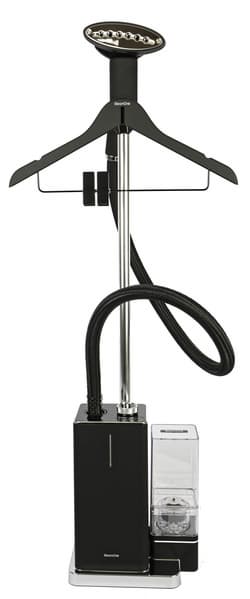 Бюджетная модель и вместе с тем абсолютно полноценный и достаточно удобный отпариватель, который может существенно облегчить выполнение задач, которые стоят перед такой техникой. В комплекте идут телескопические стойки, вешалка с плечиками и зажимами для брюк, две защитных рукавицы, насадка-щетка, пластина для отпаривания воротничков и карманов, объем бойлера — 1,46 л (мы проверили: не литр, как на шкале, и не 1,6 л, как заявлено).