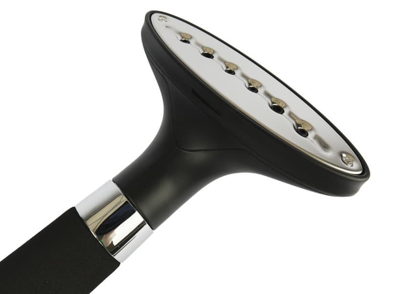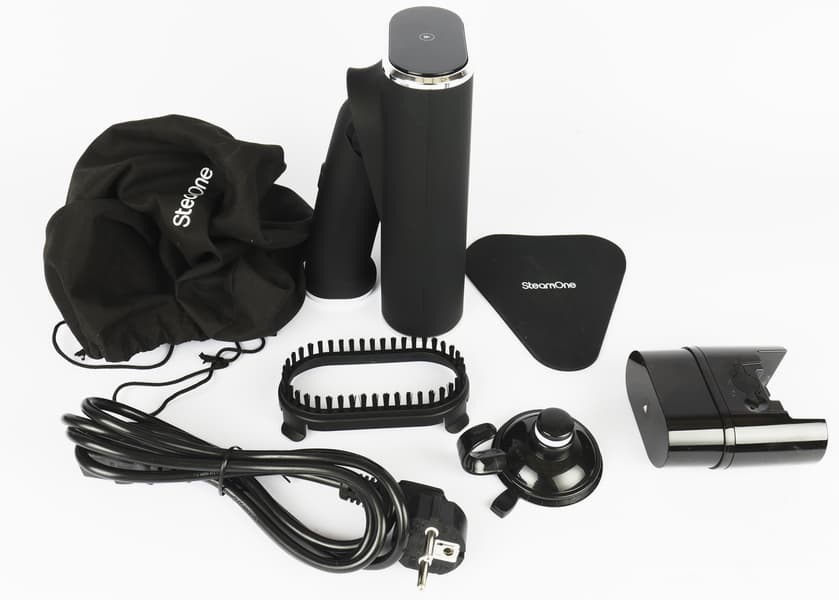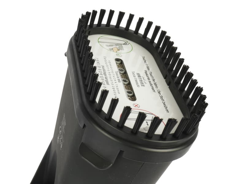 У сопла отпаривателя керамическая поверхность, которой можно (а производитель пишет, что нужно!) прикасаться к ткани. На паровую головку можно надеть и щетку для удаления с тканей ворса. В комплект входит также крючок-присоска, чтобы вешать на него плечики с одеждой, и изолирующая резиновая подставка для безопасного размещения отпаривателя на горизонтальной поверхности.