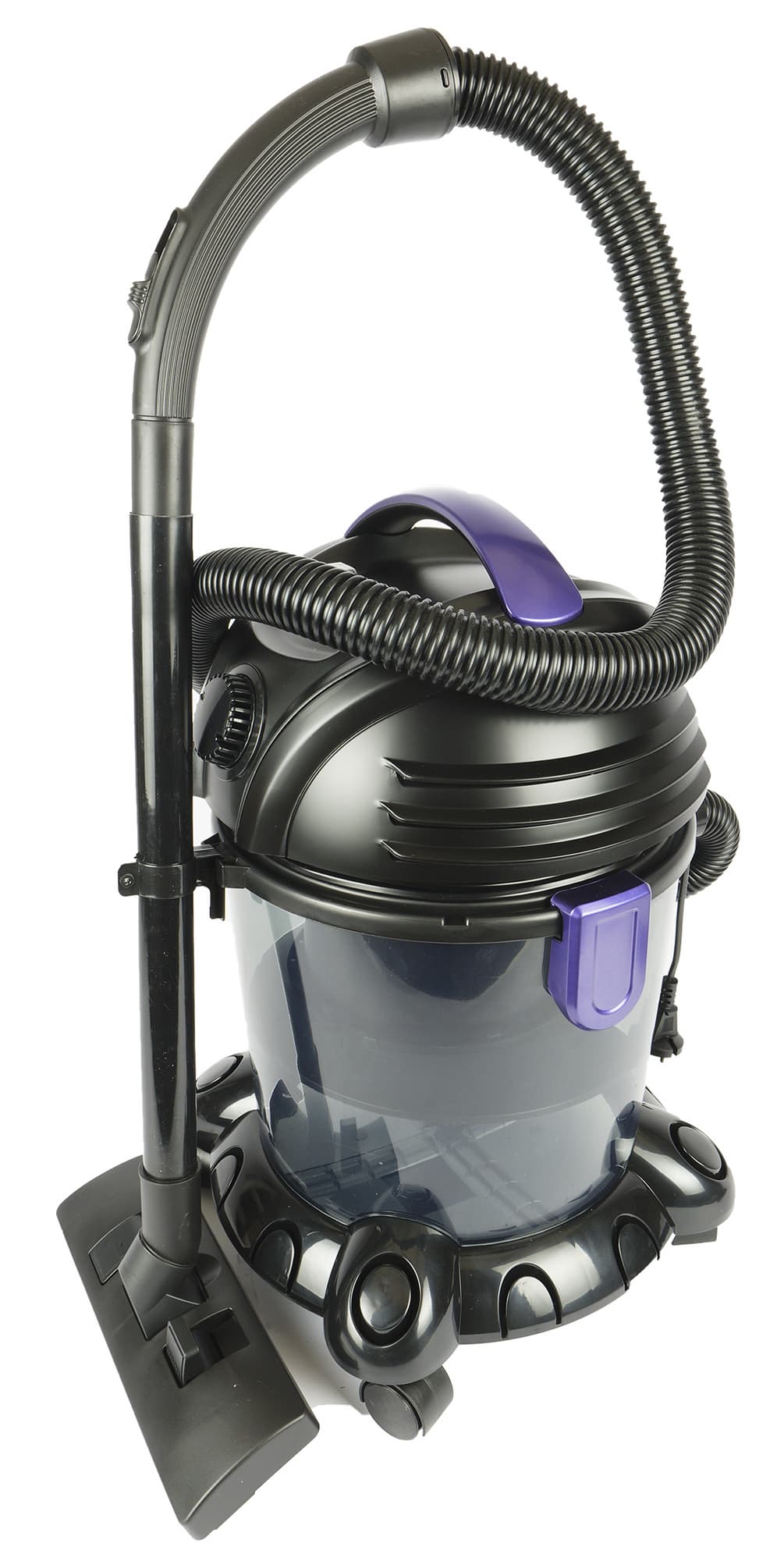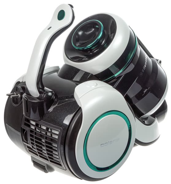 Компактный (256×325×365 мм) и легкий (4,8 кг) циклонический пылесос с контейнером объемом 1,7 литра удивил необычным креплением пылесборника к корпусу. Верхняя часть контейнера фиксируется на корпусе пылесоса при помощи откидной ручки. Чтобы снять резервуар, надо нажать на круглую кнопку. Конструкция показалась нам очень продуманной: можно и переносить пылесборник, и открывать его, не испачкав рук, а установка на место и вынимания его из корпуса не составляют ни малейшего труда. Плохо только, что контейнер выполнен из темного пластика, и это не дает видеть уровень заполненности.