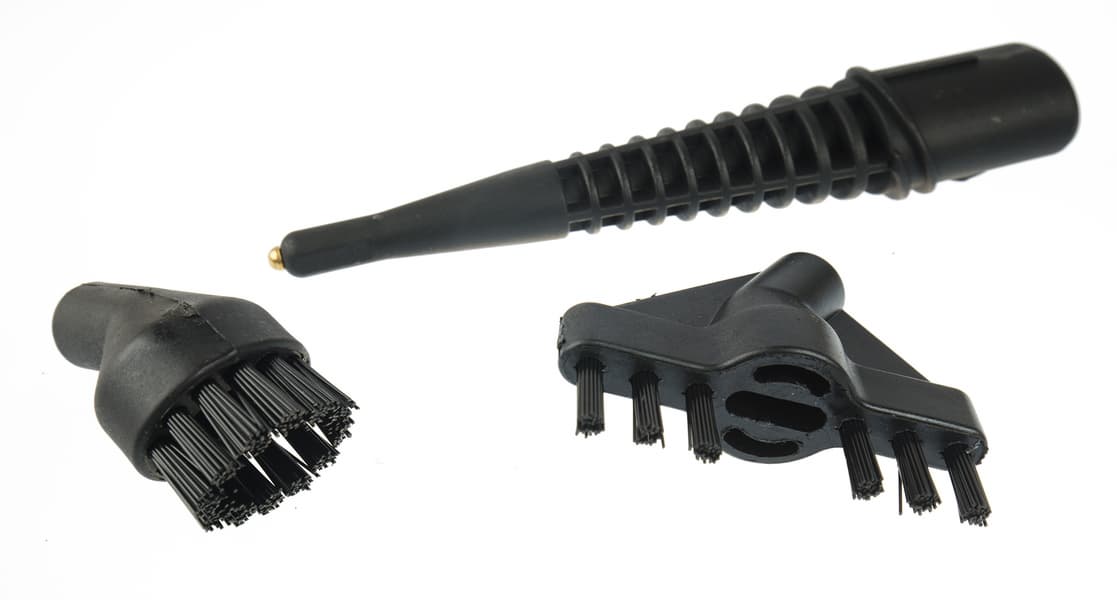 Насадки парогенератора — струйная, плоская для чистки швов между плиткой и круглая универсальная. К насадке для пола крепится тряпка для отпаривания и мытья пола и при необходимости рамка для чистки ковровых покрытий. Эти аксессуары съемные.