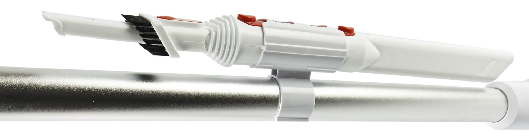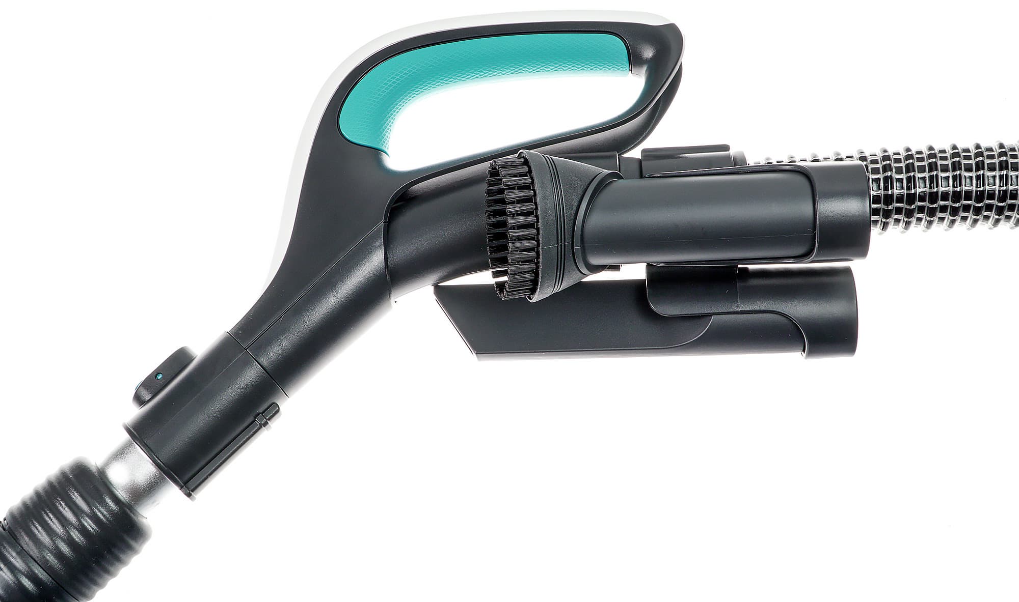 Шланг, покрытый для большей гигиеничности (меньше липнет пыль) силиконом, присоединяется к моторному отсеку двумя защелками, управляемыми кнопкой. Форма рукоятки очень эргономичная и помогает легко управлять и без того маневренным и легким пылесосом с большим радиусом действия. Рядом с рукояткой крепятся две дополнительные насадки — для мебели и щелевая.